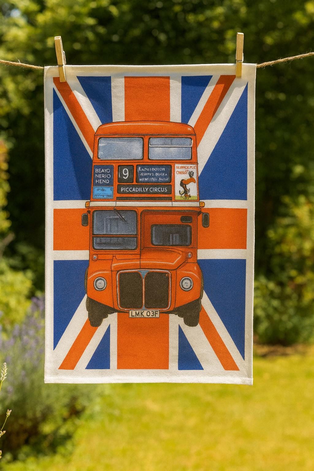 London Routemaster Bus Large Cotton Tea Towel from Half a Donkey. Classic image of the number 9 bus to Piccadilly Circus, with a Union Jack background. From the UK artist Richard Partis. Made from 100% cotton, hemmed on four sides. Cotton is high quality 185gsm. The dimensions of the Tea Towel are: 47cm x 65cm. With hanging loop.