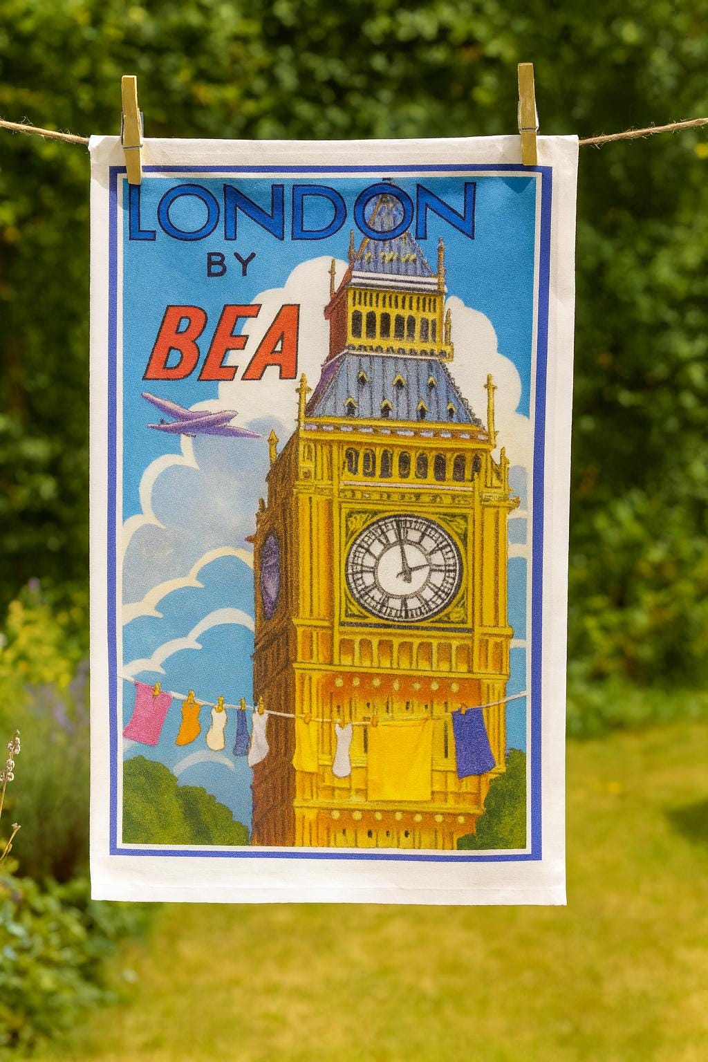 London Vintage Flight Large Cotton Tea Towel. Featuring the BEA Airline (British European Airlines) flying past Big Ben . BEA was in service from 1946 to 1974 before merged with British Overseas Airways Corporation to form British Airways. Image from the artist Richard Partis, originally from Somerset but and grew up in the Wiltshire countryside, developing a great love of the natural world and an ability to paint its beauty in great detail. The Tea Towel is made from 100% cotton, hemmed on four sides. Cotton is high quality 185gsm. The size is 47cm x 65cm. With hanging loop.