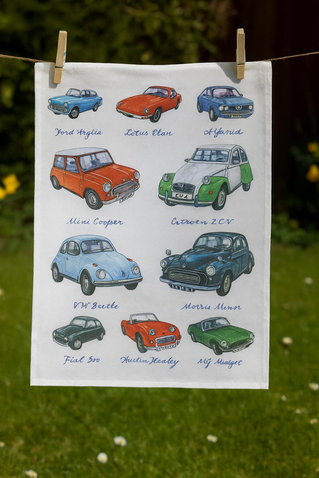 Hand drawn Great Small Cars Large Cotton Tea Towel by Half a Donkey. Featuring images of all time great small cars: Ford Anglia, Lotus Elan, Alfa Romeo Alfasud, Mini Cooper, Citroen 2CV, VW Beetle, Morris Minor, Fiat 500, Austin Healey and MG Midget. With Images from the artist Richard Partis. Made from 100% cotton, hemmed on four sides. Cotton is high quality 185gsm. The dimensions of the Tea Towel are: 47cm (w) x 65cm (h).