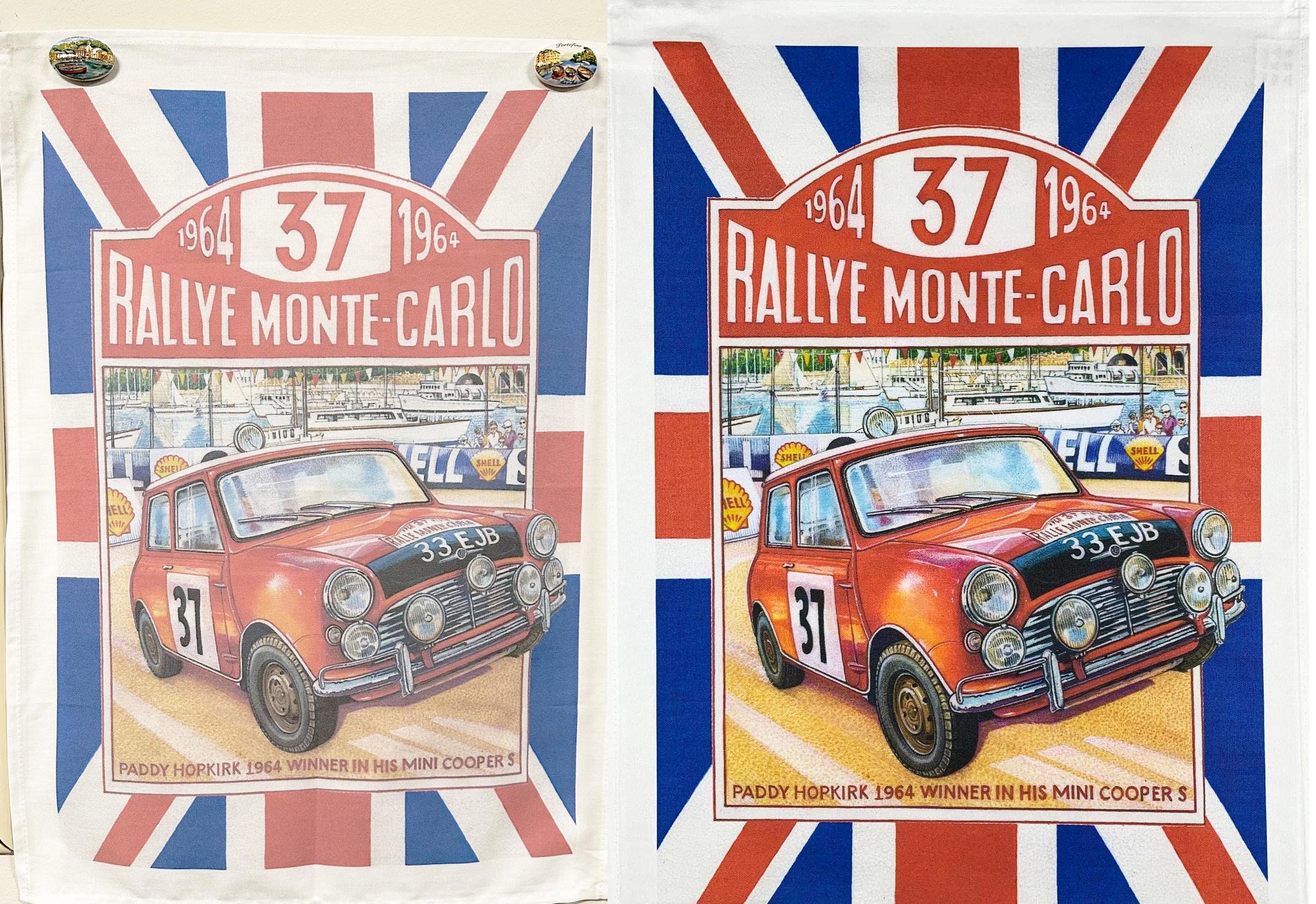 The 1964 Monte Carlo Rally Large Cotton Tea Towel from Half a Donkey. Retro style poster, featuring Car 37, driven by Paddy Hopkirk, Winner, in his Mini Cooper S. No one expected him to win, not the competition, not the race officials, and not even the driver himself. Yet 55 years ago, Patrick “Paddy” Hopkirk and his co-driver Henry Liddon came out ahead in one of the greatest David versus Goliath motorsports battles ever. Pitched against factory teams from Mercedes-Benz, Saab, Volvo, Citroën, and Ford’s onslaught of eight V-8-powered Falcons, Hopkirk’s bright red Mini Cooper S emerged victorious as the winner of the 1964 Monte Carlo rally. With Images from the artist Richard Partis. Made from 100% cotton, hemmed on four sides. Cotton is high quality 185gsm. The dimensions of the Tea Towel are: 47cm (w) x 65cm (h).
