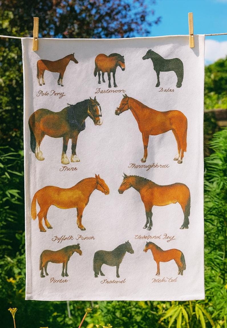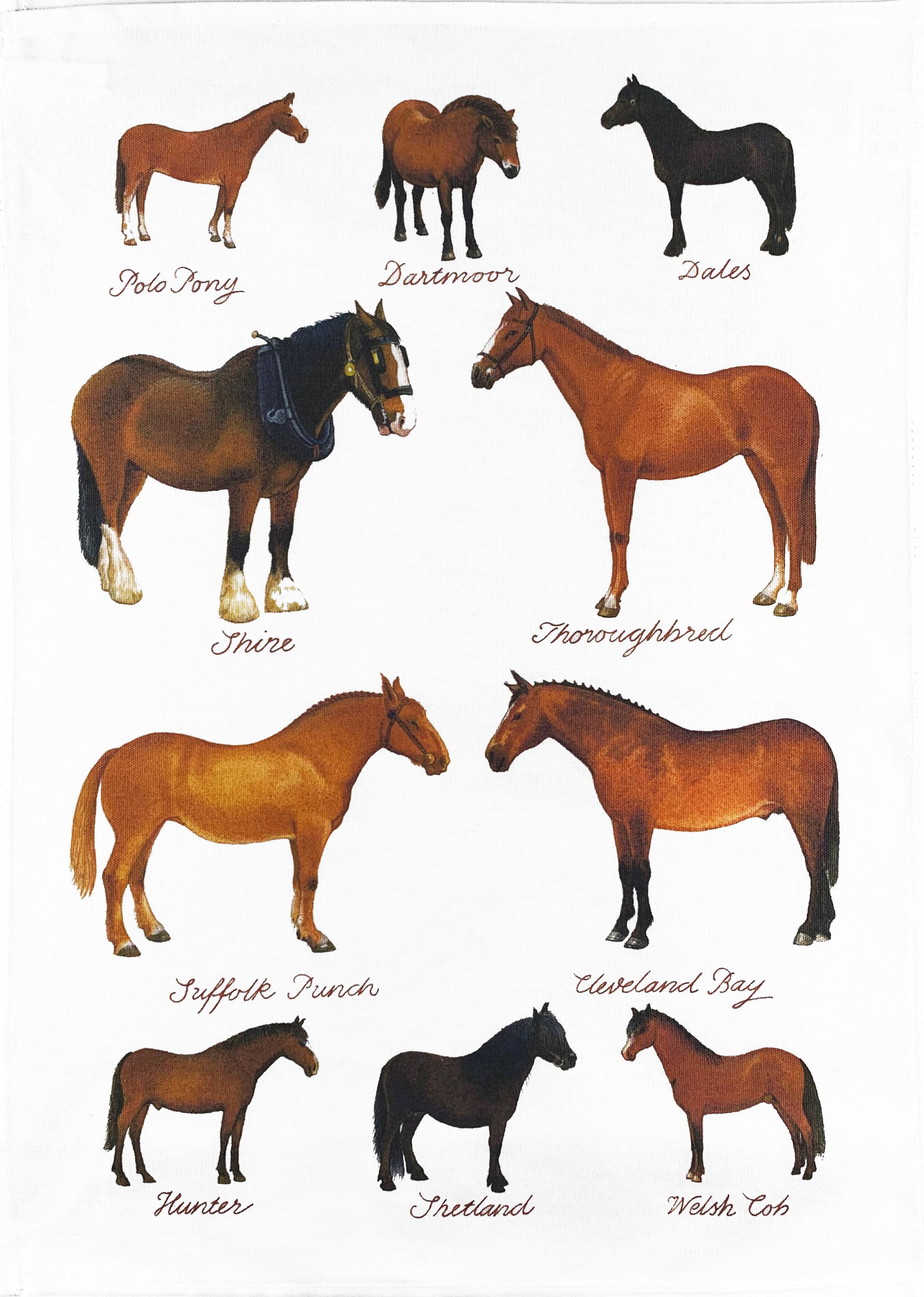 Hand Drawn Collection of Horse Breeds Large Cotton Tea Towel by Half a Donkey. Beautiful images of a Polo Pony, Dartmoor, Dales, Shire, Thoroughbred, Suffolk Punch, Cleveland Bay, Hunter, Shetland and Welsh Cob. With Images from the artist Richard Partis. Made from 100% cotton, hemmed on four sides. Cotton is high quality 185gsm. The dimensions of the Tea Towel are: 47cm (w) x 65cm (h).