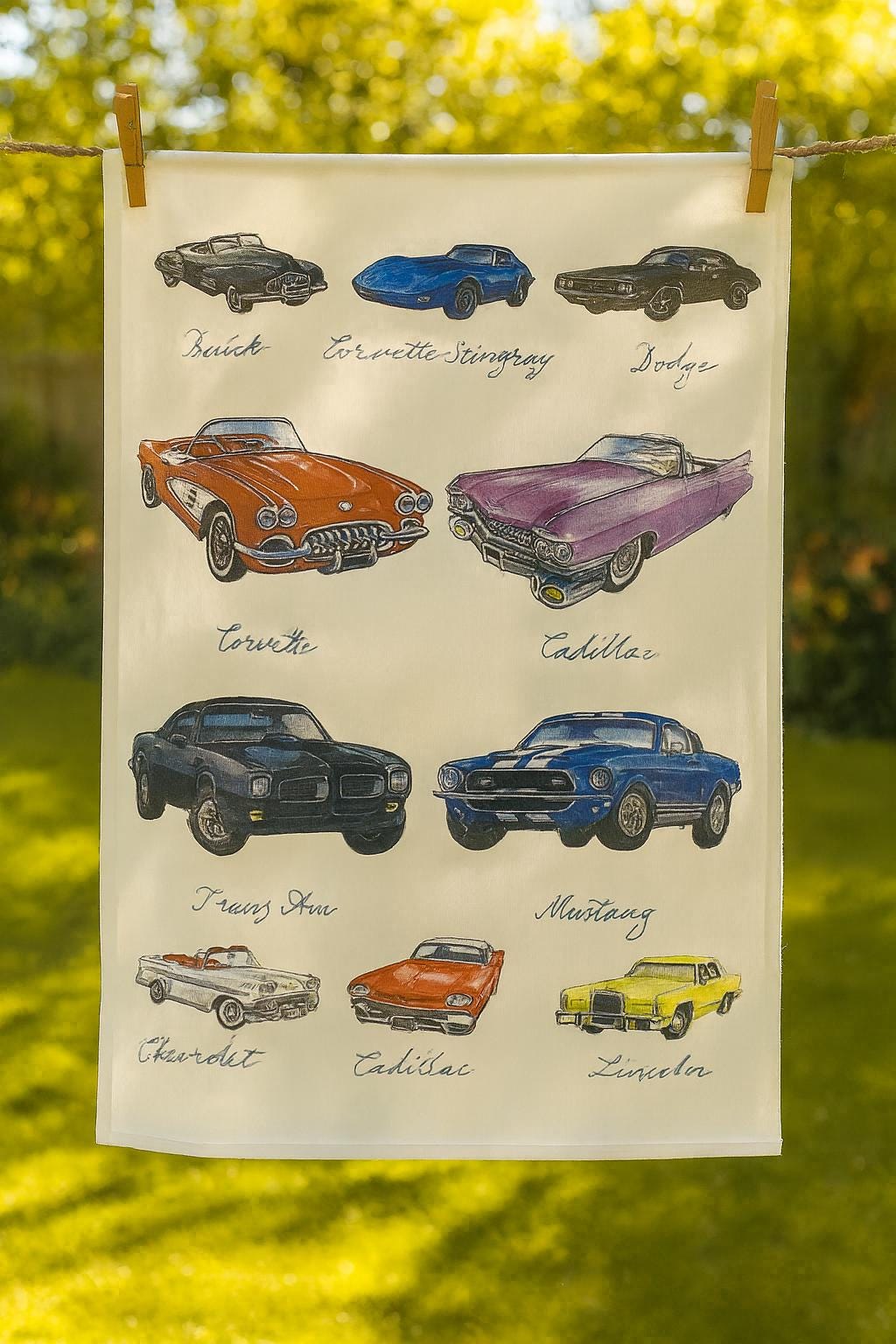 Hand Drawn Great American Cars Collection Large Cotton Tea Towel by Half a Donkey. Great collection of classic American cars such as the Buick, Corvette, Dodge, Cadillac, Lincoln and more. With Images from the artist Richard Partis. Made from 100% cotton, hemmed on four sides. Cotton is high quality 185gsm. The dimensions of the Tea Towel are: 47cm (w) x 65cm (h).