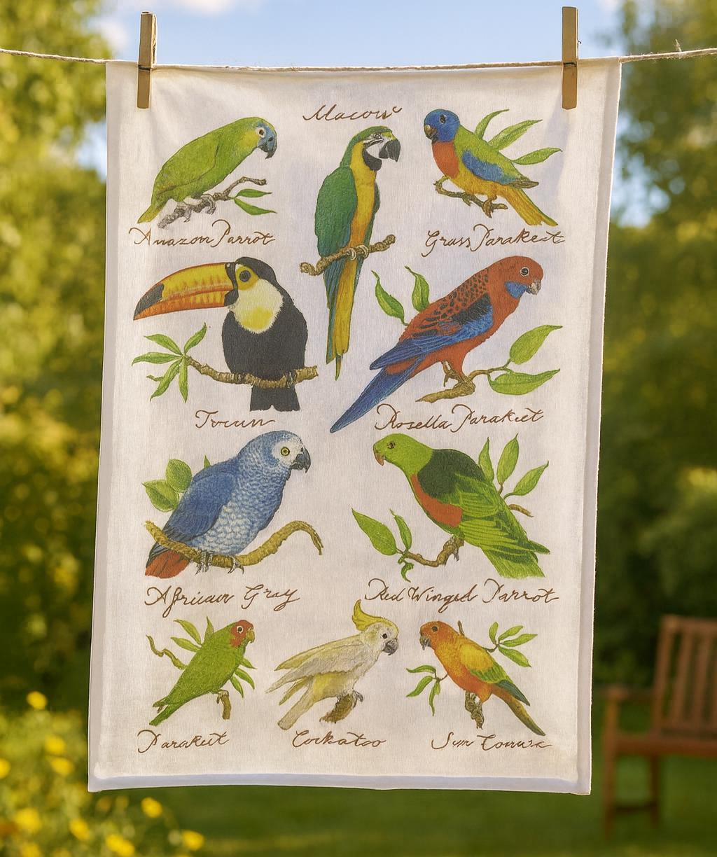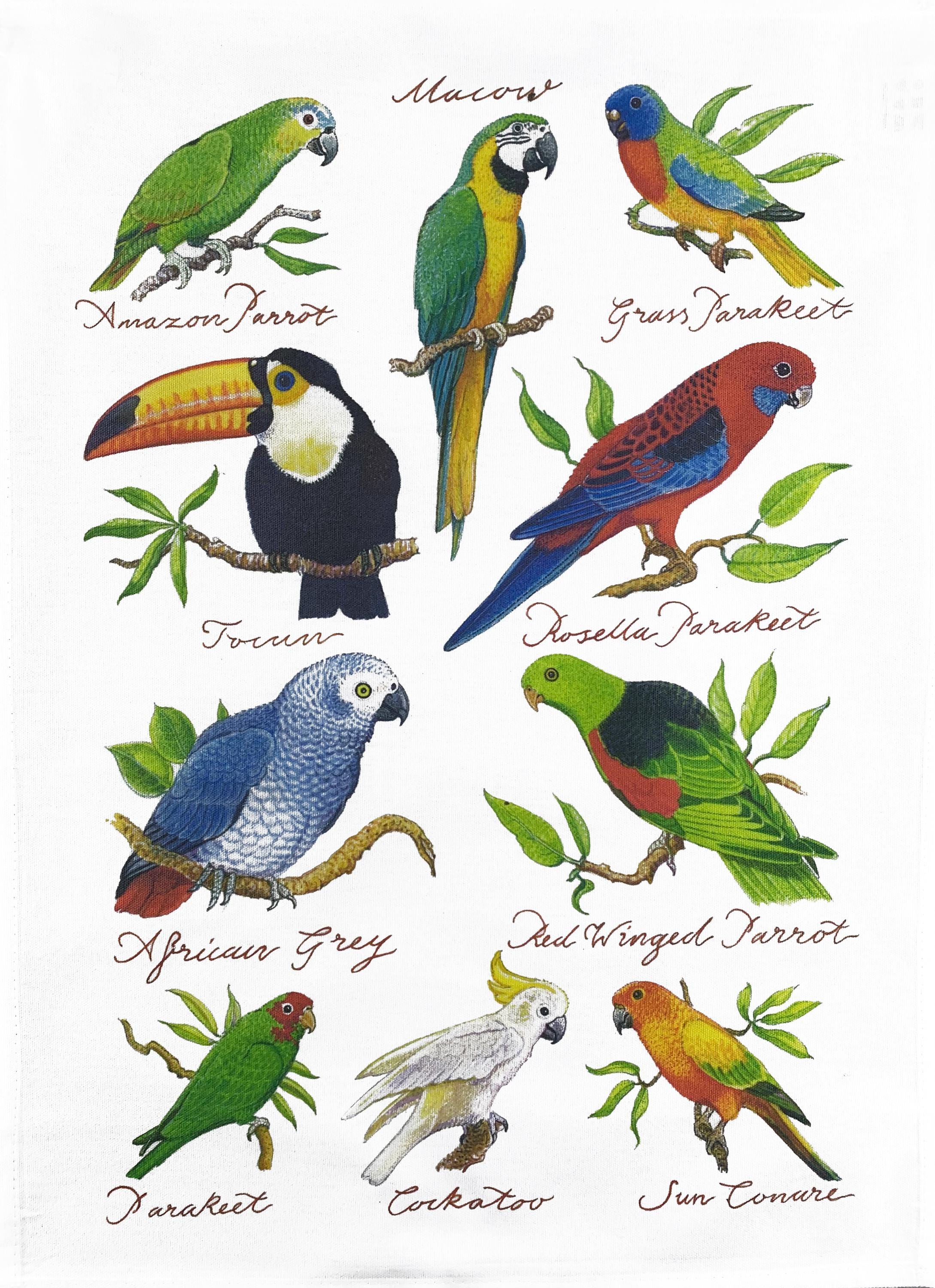 Hand Drawn Tropical Birds Collection Large Cotton Tea Towel from Half a Donkey. Colourful images of the various breeds of Parrots, Parakeets, Macaws, Toucans and Cockatoos. With Images from the artist Richard Partis. Made from 100% cotton, hemmed on four sides. Cotton is high quality 185gsm. The dimensions of the Tea Towel are: 47cm (w) x 65cm (h).