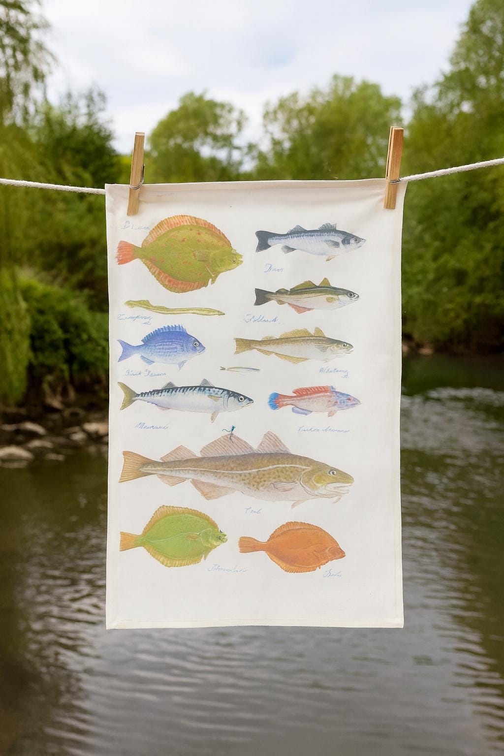 This charming sea fishes tea towel brings the beauty of British coastal waters into your kitchen. Featuring exquisite watercolour illustrations by artist Richard Partis, this large cotton tea towel showcases a delightful collection of native fish species including plaice, bass, mackerel, cod, and cuckoo wrasse, each carefully labelled with their common names. The artist's detailed work captures the natural colours and distinctive features of each species, reflecting his deep appreciation for the natural world developed during his childhood in the Wiltshire countryside. Made in the UK from 100% cotton with a plain weave construction and weighing 185 grams per square metre, this rectangular tea towel measures 47cm wide by 65cm high, providing ample coverage for drying dishes or displaying as decorative kitchen art. The natural cotton fabric is both absorbent and durable, whilst the convenient hanging loop allows for easy storage. Perfect for marine life enthusiasts, keen fishermen, or anyone who appreciates beautifully illustrated homewares, this tea towel adds a touch of coastal charm to everyday kitchen tasks.