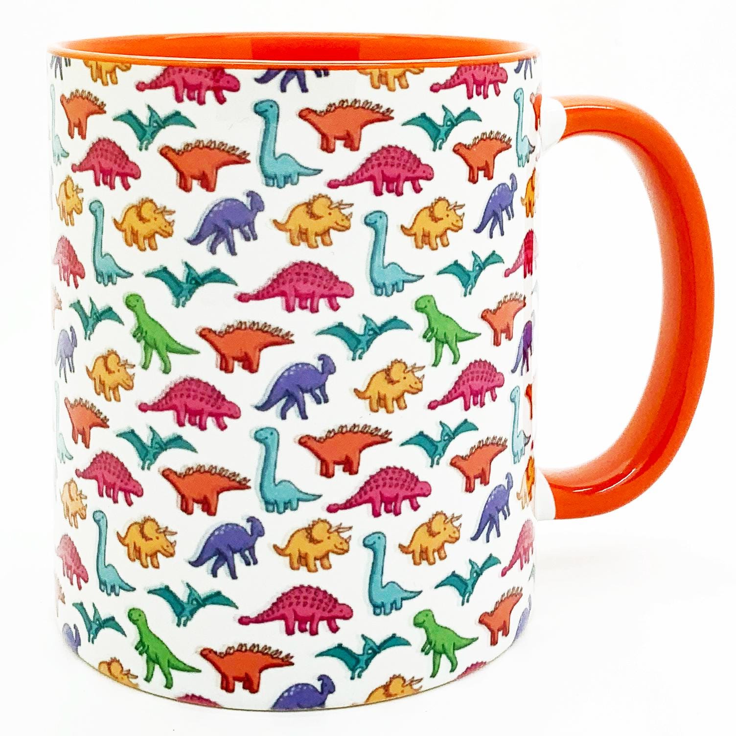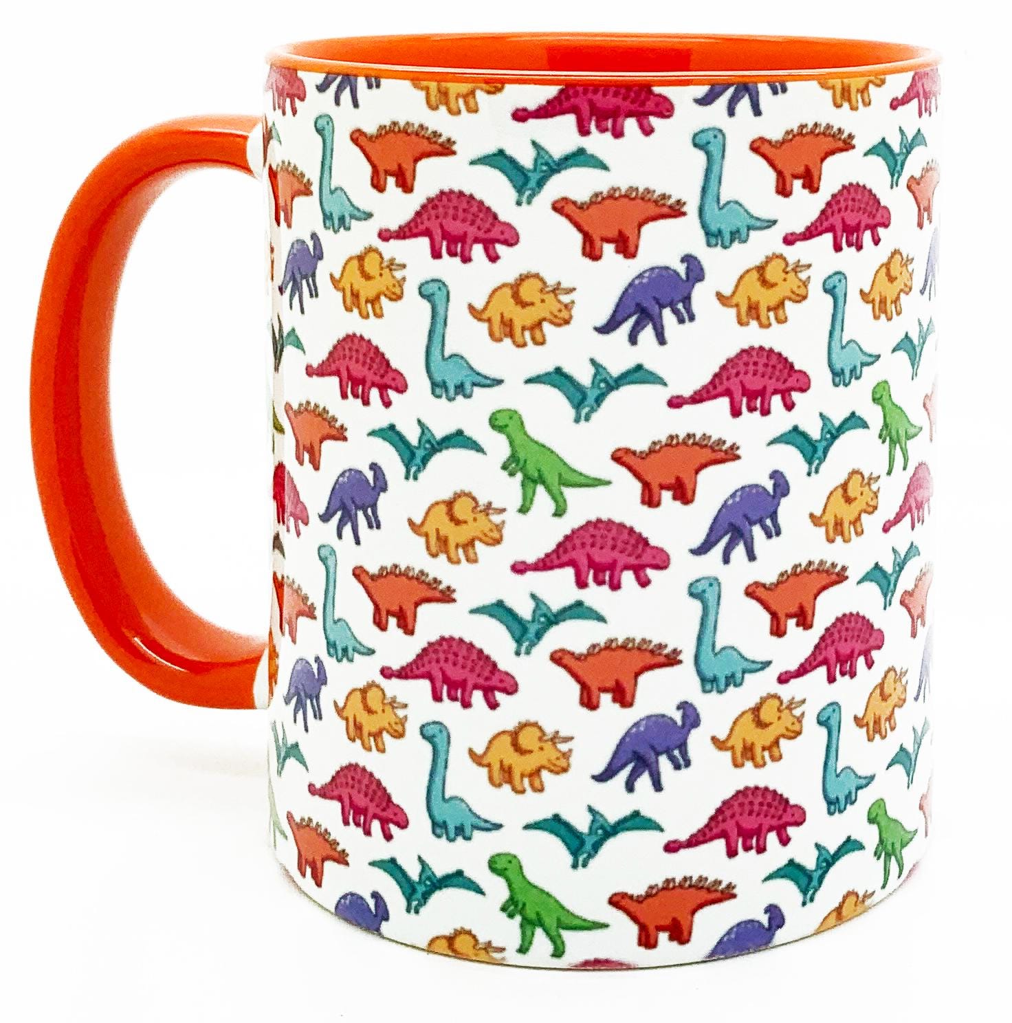 The Colourful Dinosaur Mug with orange inner and handle by Half a Donkey! A very colourful collection of dinosaurs. From your Stegosaurus, to your Tyrannosaurus, Diplodocus and Triceratops. High quality ceramic mug. Height 9.5cm Diameter 8.2 cm Capacity is 310 ml (11oz). From the Series 9 Nature by Half a Donkey Ltd.