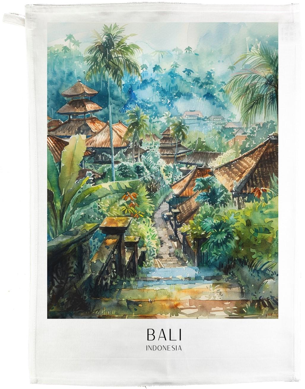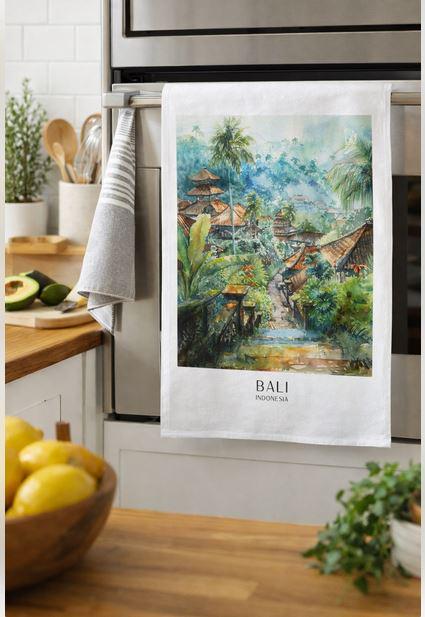This large cotton tea towel brings the enchanting beauty of Bali, Indonesia into your kitchen. Measuring 47cm wide by 65cm high, this generously sized towel features a stunning watercolour illustration of a traditional Balinese village scene, complete with iconic tiered temple roofs, lush tropical palms, and misty jungle landscapes. Crafted from 100% cotton with a plain weave construction and weighing 185 grams per square metre, this tea towel offers excellent absorbency and durability for everyday use. The natural white fabric provides the perfect canvas for the vibrant artwork, making it as decorative as it is functional. A convenient hanging loop allows for easy storage when not in use. The vintage travel poster style design captures the essence of Indonesia's most beloved island destination, making this tea towel an ideal choice for those who appreciate travel-inspired home accessories. Whether you're drying dishes, covering rising dough, or simply adding a touch of wanderlust to your kitchen décor, this rectangular tea towel delivers both practicality and visual appeal. Care instructions recommend washing at 40 degrees, using chlorine bleach on whites only, and avoiding tumble drying. Standard packaging ensures your tea towel arrives in pristine condition.