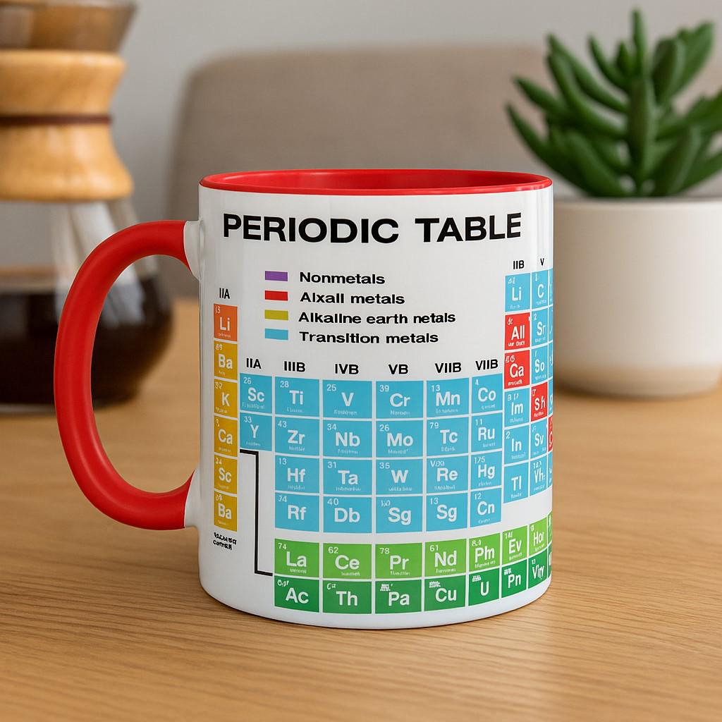 The Periodic Table of Elements Educational Ceramic Mug, with a red glazed inner and handle. Featuring all the traditional groups, metals, transitional elements , the Halogens etc. Designed and printed in Britain. A high quality ceramic mug . Height is 9cm, diameter 7.5cm, with a capacity of 270 ml (9oz). From the Series 10 Educational Range from Half a Donkey