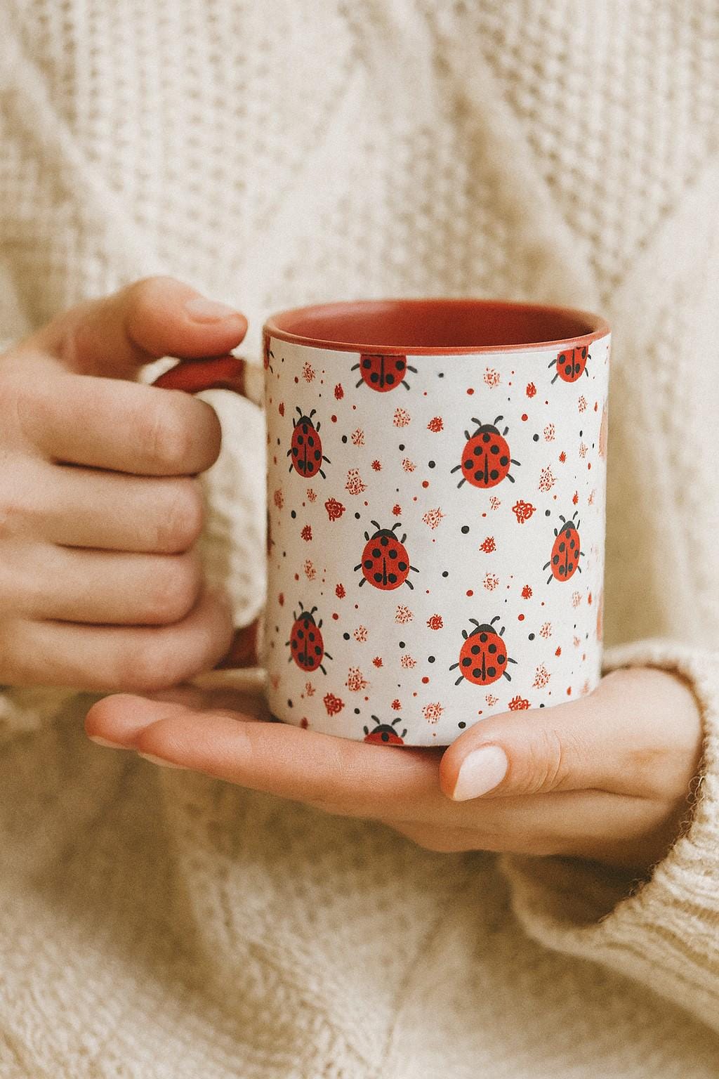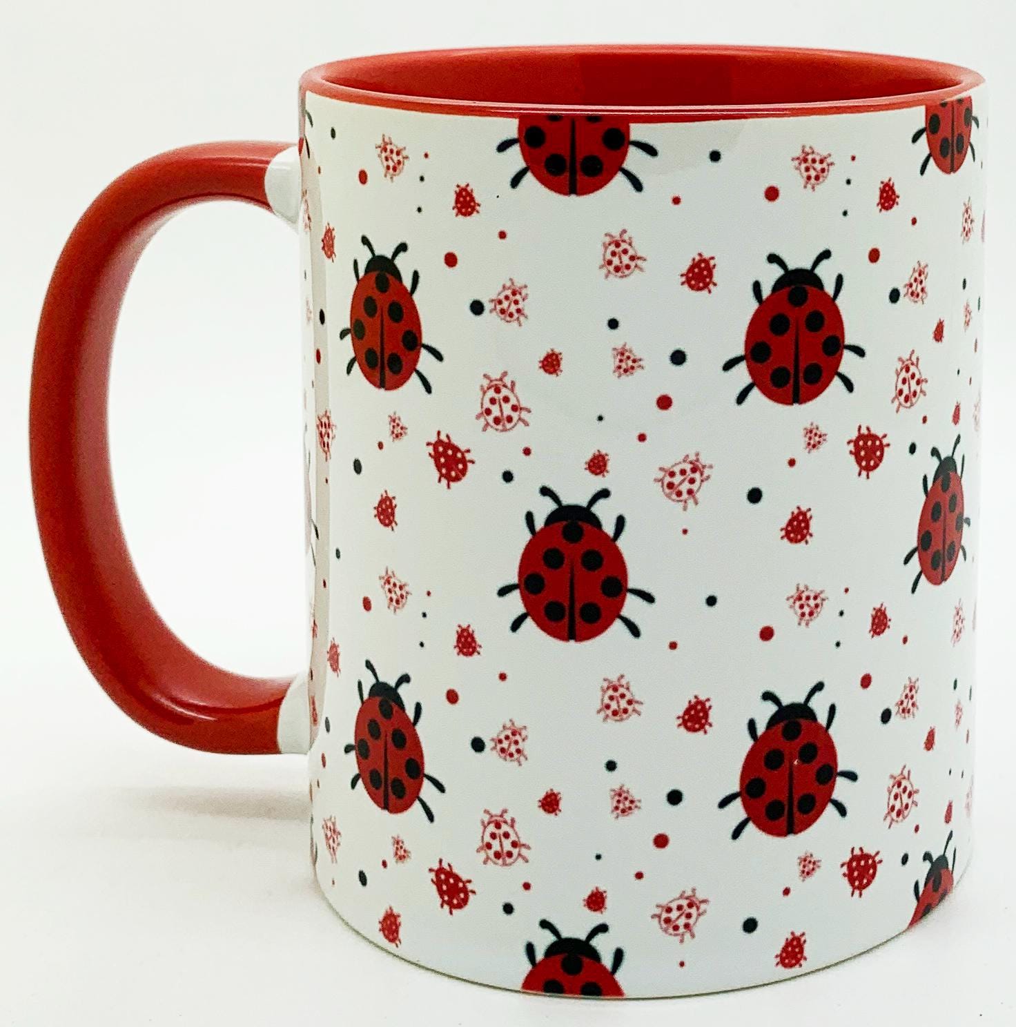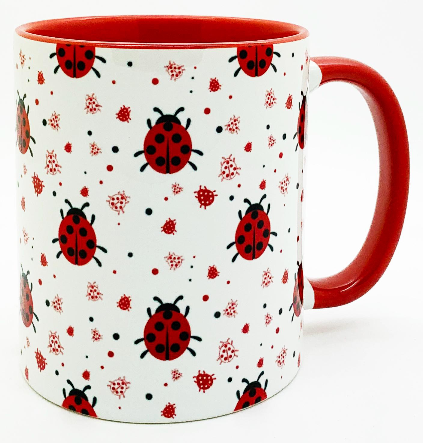 The Red Ladybird Mug with red glazed handle and inner from Half a Donkey The Ladybirds or Ladybugs as they are also known are printed all round the mug,. A high quality ceramic mug with a red glazed handle and inner. Height is 9.5cm, diameter 8.2cm, with a capacity of 310 ml. From the Series 9 Nature Range by Half a Donkey Ltd.