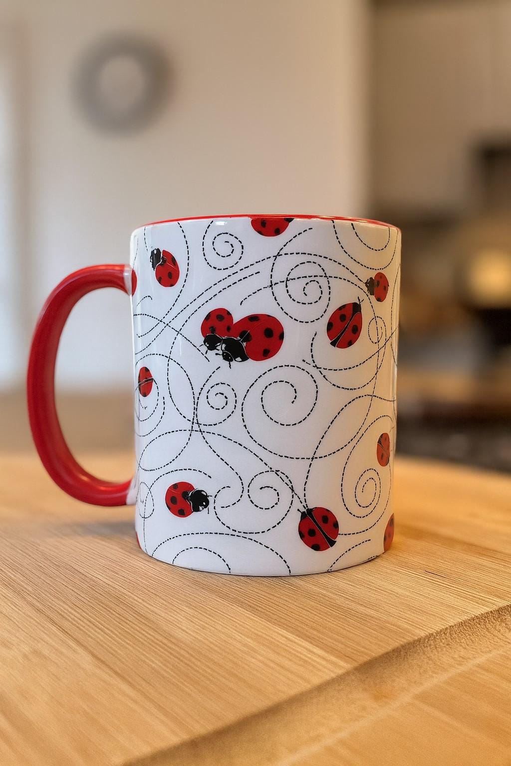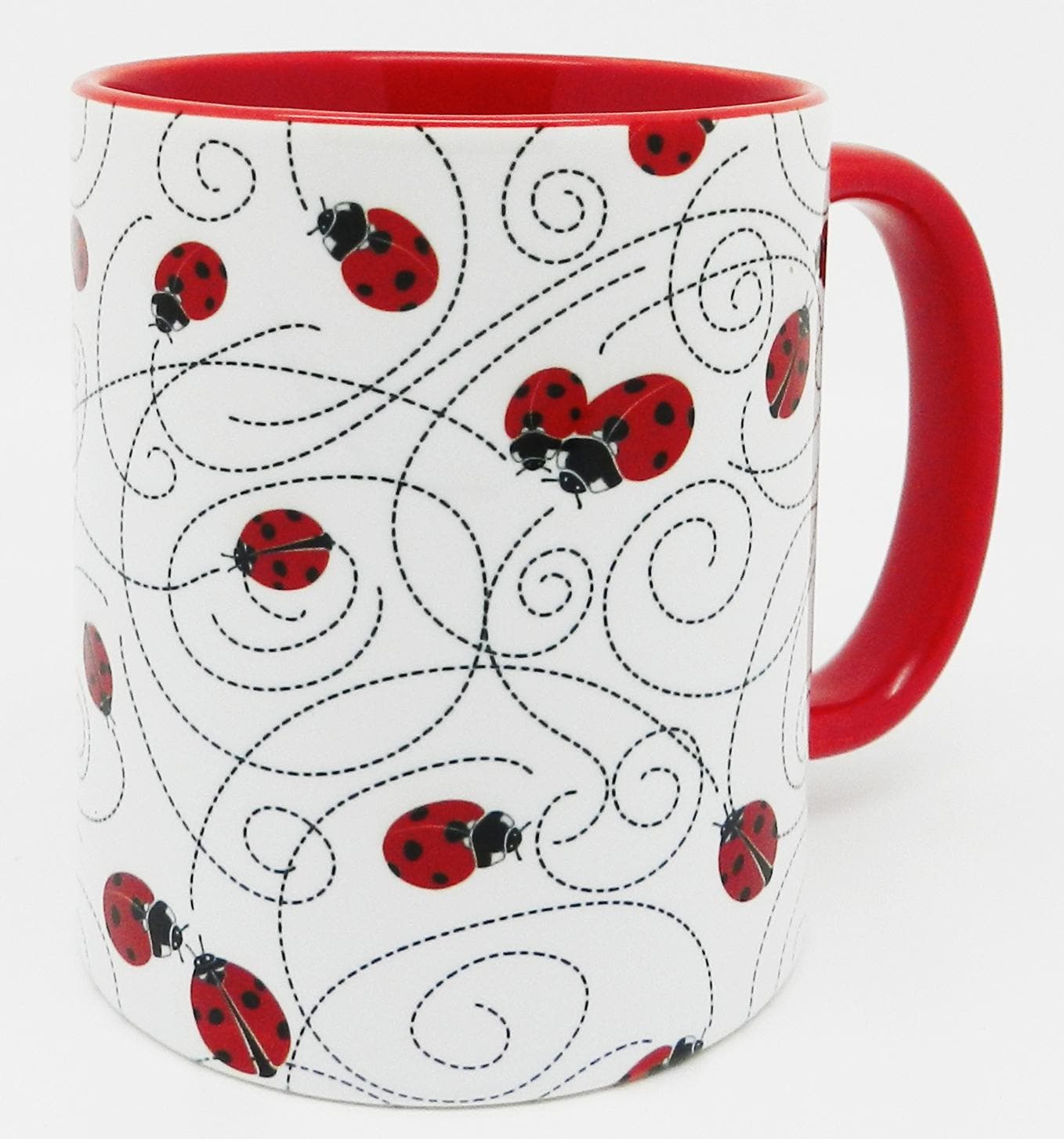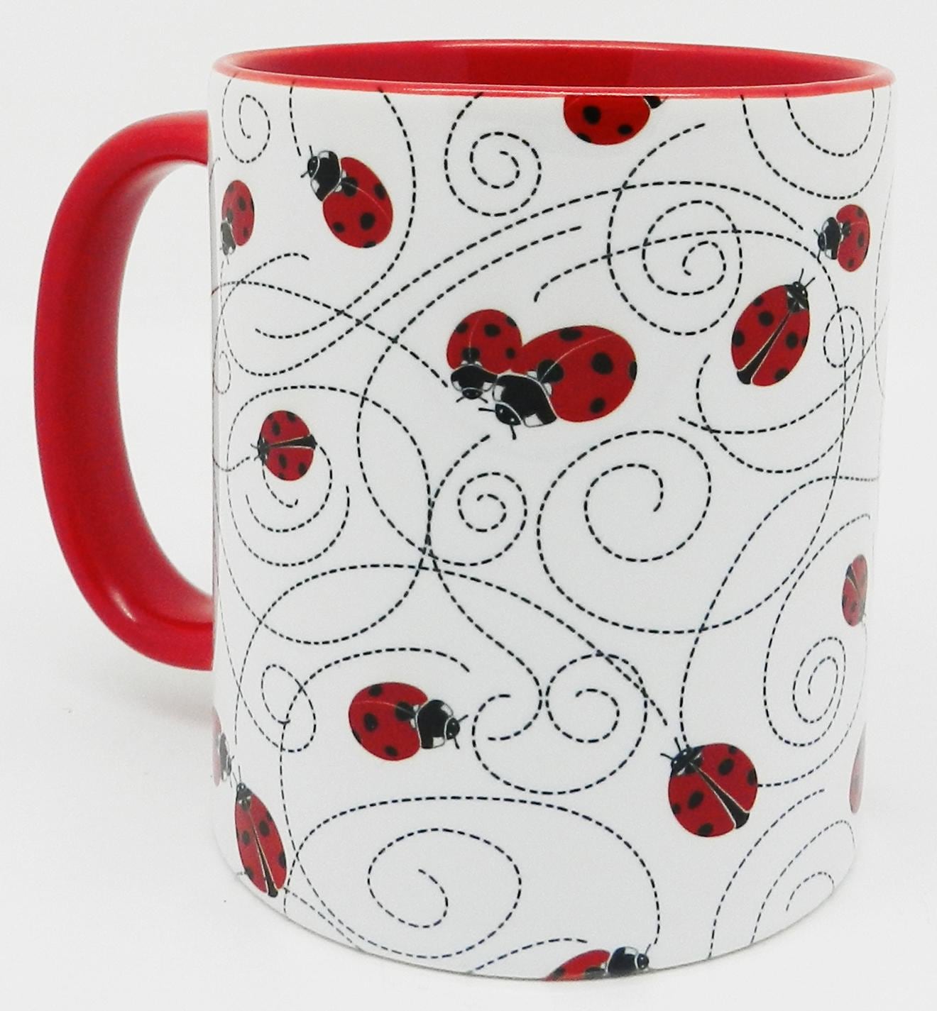 The Red Ladybird Trail Mug with red glazed handle and inner from Half a Donkey. The Ladybirds or Ladybugs as they are also known are printed all round the mug, with a black trail marking their route. A high quality ceramic mug with a red glazed handle and inner. Height is 9.5cm, diameter 8.2cm, with a capacity of 310 ml . From the Series 9 Nature Range by Half a Donkey Ltd.