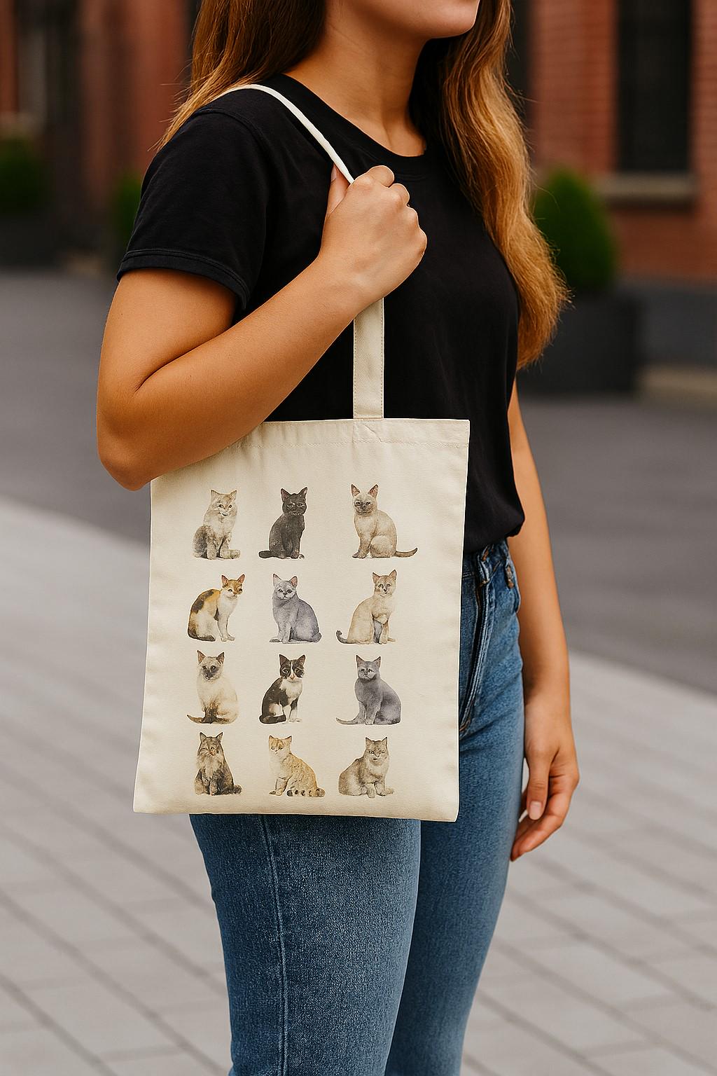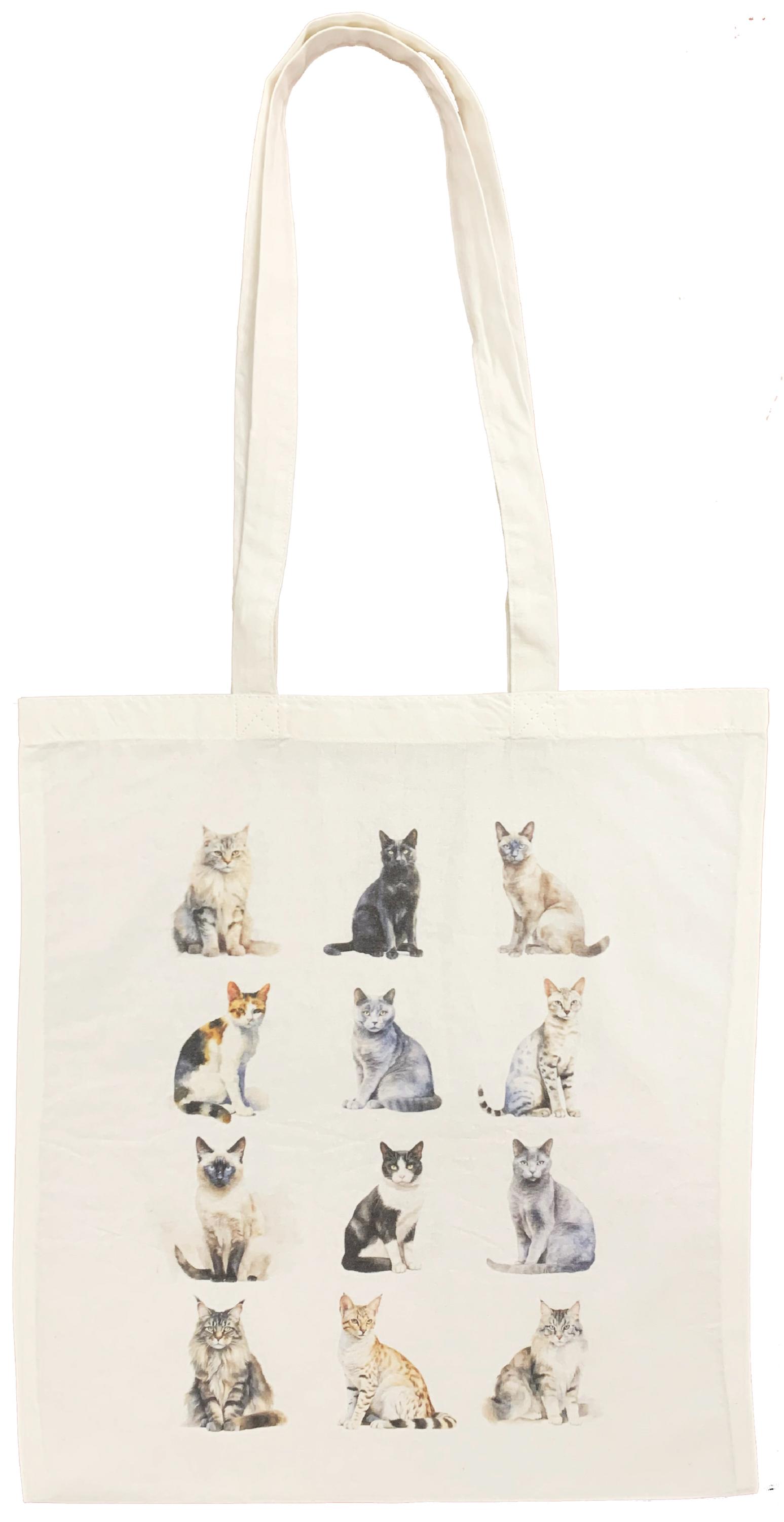 This charming cotton tote bag features a delightful artistic portrait showcasing twelve different cats in various poses and breeds. Perfect for cat lovers and everyday use, this versatile bag combines practicality with personality. Crafted from 100% cotton canvas weighing 140g, this lightweight yet durable tote measures 38 x 43 centimetres, providing ample space for your shopping, books, or daily essentials . The bag features attractive prints on both sides and comes with comfortable 30cm cotton handles for easy carrying over the shoulder. The basic cotton lining adds extra durability whilst maintaining the bag's lightweight feel at just 182 grams. Suitable for adults of all genders, this unisex tote is ideal for shopping trips, trips to the library, or casual everyday use. Care is simple – machine wash at 30 degrees Celsius, avoid tumble drying, and iron on the reverse side to maintain the vibrant cat portraits. A practical and stylish accessory that celebrates your love for feline friends.