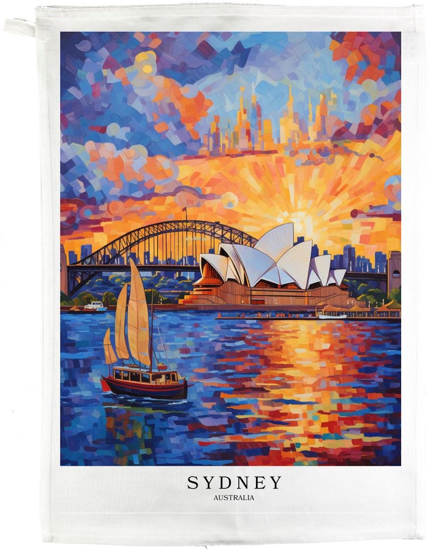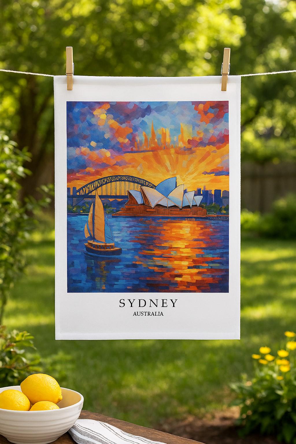 This large cotton tea towel brings the vibrant beauty of Sydney, Australia into your kitchen. Featuring a stunning artistic interpretation of the iconic Sydney Opera House and Harbour Bridge at sunset, this tea towel transforms a practical everyday item into a piece of decorative art. The colourful design captures the essence of Australia's most famous harbour city with its distinctive landmarks rendered in a contemporary style. Made in the UK by Half a Donkey, this rectangular tea towel measures 47 x 65 centimetres, providing ample coverage for drying dishes, covering bread, or displaying as kitchen décor. Crafted from 100% cotton with a plain weave construction at 185 grams per square metre, it offers excellent absorbency and durability for everyday use. The natural cotton fabric is soft yet hardwearing, perfect for regular kitchen tasks. A convenient hanging loop allows for easy storage when not in use. This vintage travel poster-style tea towel makes an ideal gift for anyone who loves Sydney, Australia, or simply appreciates beautiful kitchen textiles. Whether you're an Australian expat, a travel enthusiast, or someone who values quality homewares, this tea towel combines functionality with artistic flair.