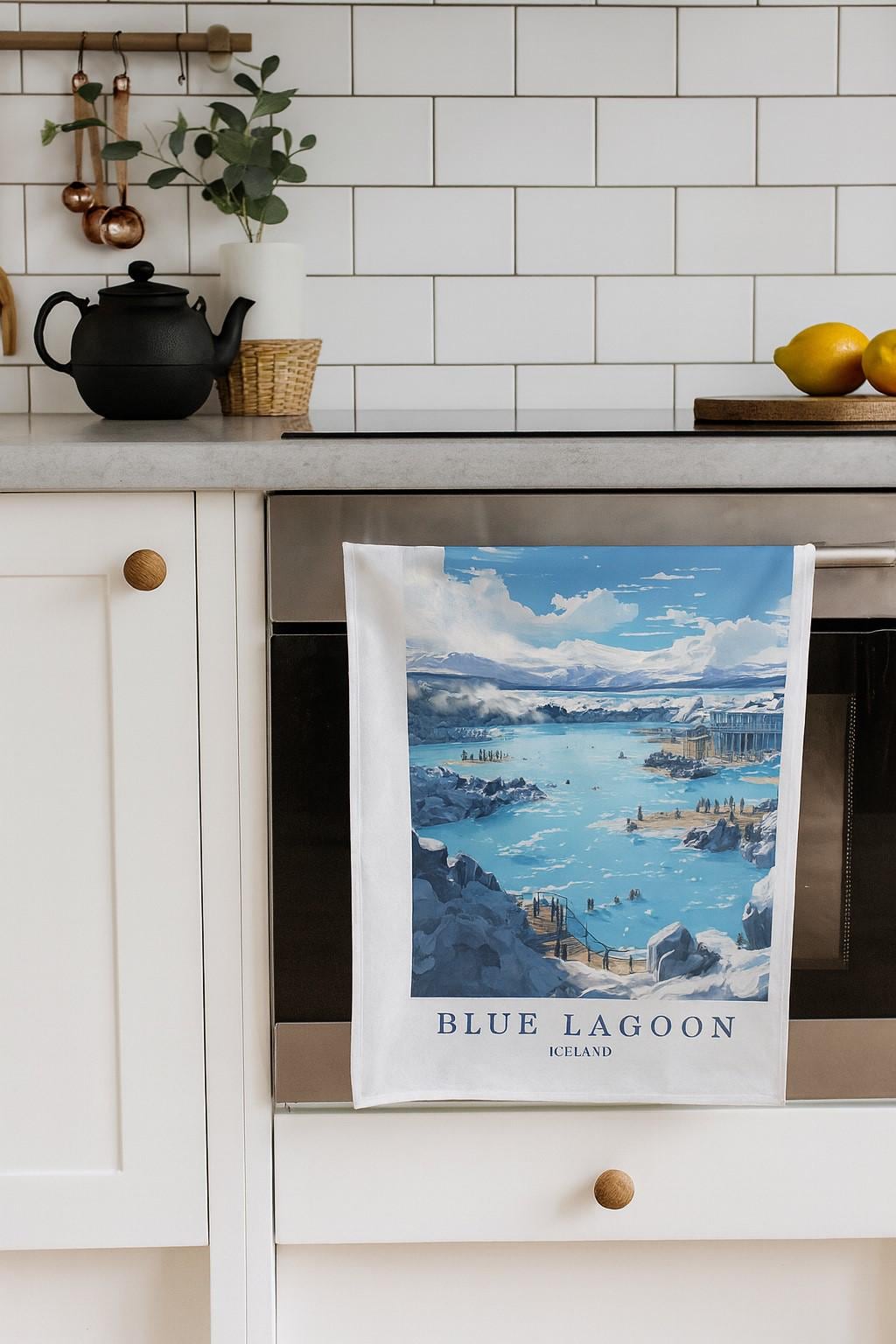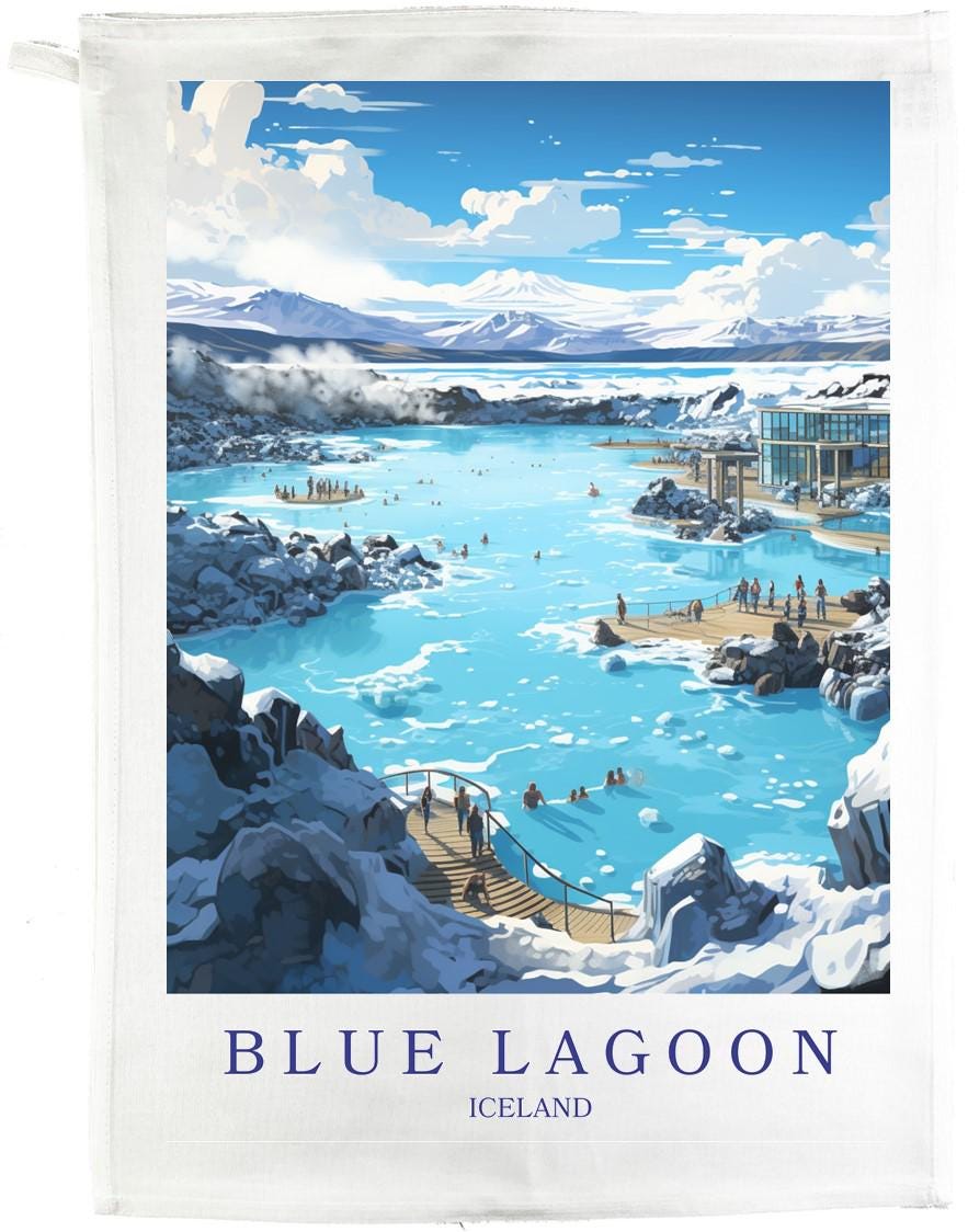 This large cotton tea towel features a stunning vintage travel poster design celebrating Iceland's iconic Blue Lagoon. Measuring 47 x 65cm, this rectangular kitchen cloth is crafted from 100% cotton with a plain weave construction and a fabric weight of 185 grams per square metre, ensuring excellent absorbency and durability for everyday use. The pristine white background showcases a beautiful illustration of the famous geothermal spa, complete with its distinctive milky-blue waters, volcanic rock formations, and mountain vistas. Perfect for adults who appreciate travel-inspired home décor, this tea towel combines practical functionality with artistic appeal. The cotton fabric is soft yet hardwearing, making it ideal for drying dishes, glassware, and kitchen surfaces. A convenient hanging loop allows for easy storage when not in use. Care instructions are straightforward: machine wash at 40 degrees, do not bleach, use chlorine bleach on white only, iron as needed, do not tumble dry, and dry cleaning is permitted. This versatile kitchen essential brings a touch of Icelandic charm to your home whilst serving as a reliable everyday companion in the kitchen.