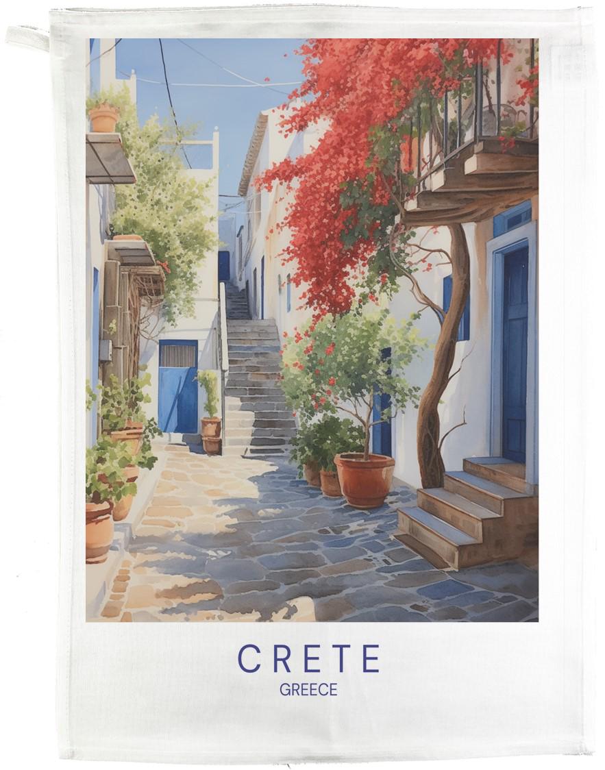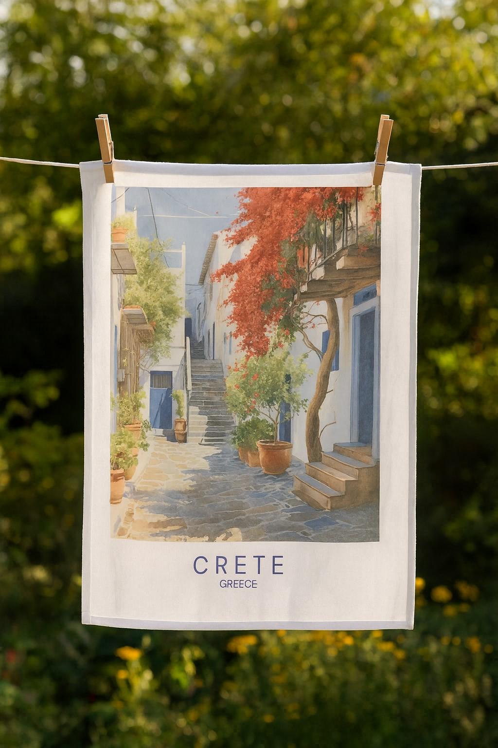 This charming cotton tea towel brings the beauty of Crete right into your kitchen. Measuring 47 x 65cm, it features a stunning vintage travel poster design showcasing a picturesque Greek street scene complete with vibrant bougainvillea, traditional whitewashed buildings, and stone steps that capture the essence of Mediterranean charm. Crafted from 100% cotton with a plain weave construction and weighing 185 grams per square metre, this rectangular tea towel offers excellent absorbency and durability for everyday use. The natural cotton fabric is gentle on delicate glassware and crockery whilst being robust enough to handle daily kitchen tasks. A convenient hanging loop allows for easy storage when not in use. The towel's care instructions recommend washing at 40 degrees, using chlorine bleach on white only, avoiding tumble drying, and dry cleaning with perchloroethylene. Whether you're drying dishes, covering rising dough, or simply adding a touch of Greek-inspired décor to your kitchen, this tea towel combines practical functionality with aesthetic appeal. Perfect for those who appreciate vintage travel aesthetics or have fond memories of Greek island holidays.