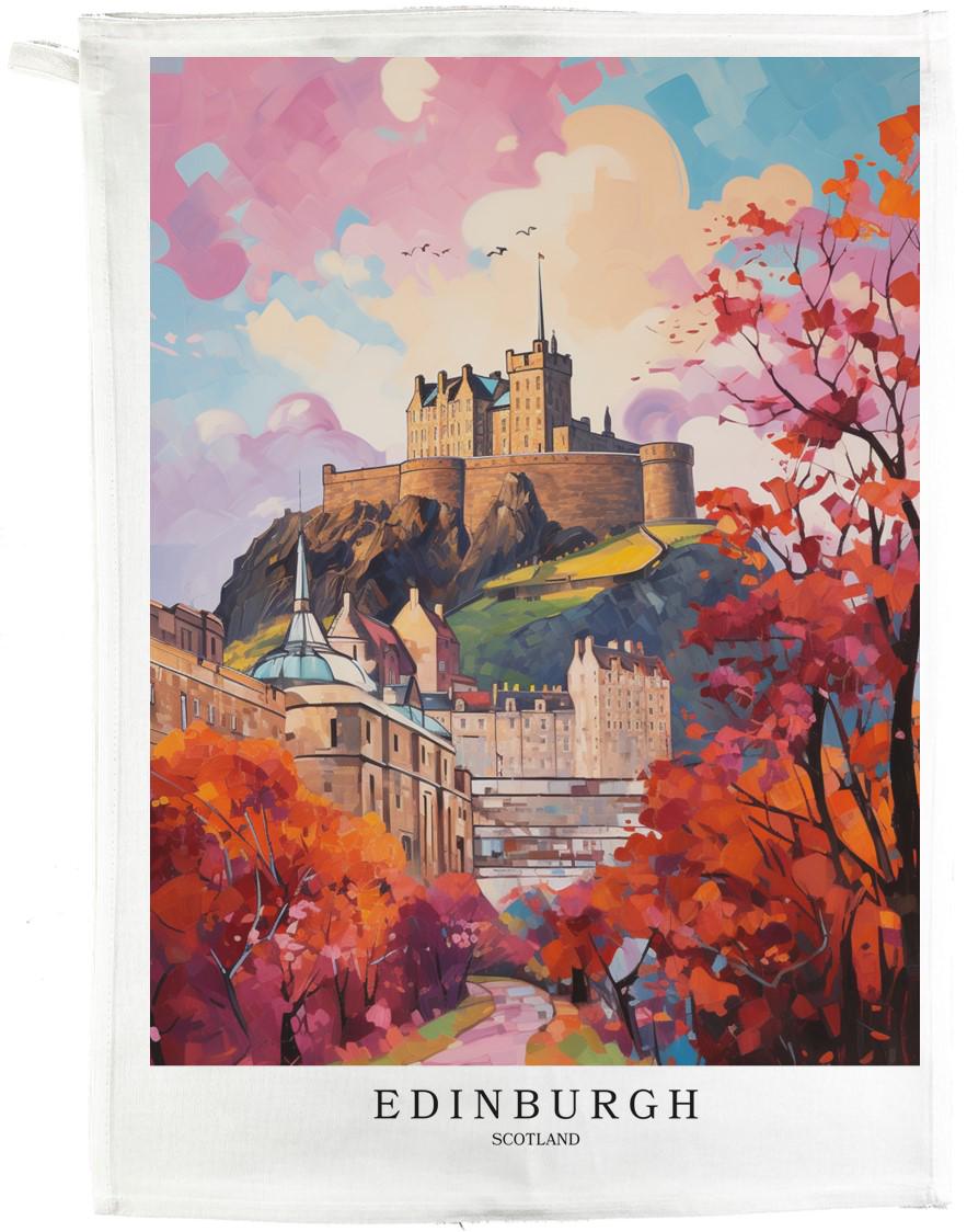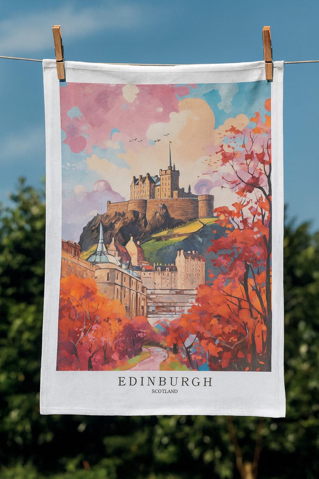 This large cotton tea towel brings the vibrant beauty of Edinburgh, Scotland into your kitchen. Measuring 47 x 65 centimetres, this generously sized tea towel features a stunning vintage travel poster design showcasing Edinburgh Castle perched majestically atop its volcanic rock, surrounded by the city's iconic autumn foliage in brilliant oranges and reds. Made from 100% cotton with a plain weave construction and weighing 185 grams per square metre, this tea towel offers excellent absorbency and durability for everyday use. The rectangular towel features a convenient hanging loop for easy storage and display. Its white base colour allows the colourful Edinburgh artwork to truly shine, making it both a practical kitchen essential and a decorative piece that celebrates Scottish heritage. The cotton fabric is machine washable at 40 degrees, though bleach should be avoided and it should be washed with whites only. This tea towel is perfect for drying dishes, covering rising dough, or simply adding a touch of Scottish charm to your home. Whether you're a Scotland enthusiast, an Edinburgh resident, or simply appreciate beautiful functional homewares, this tea towel makes an excellent addition to any kitchen.