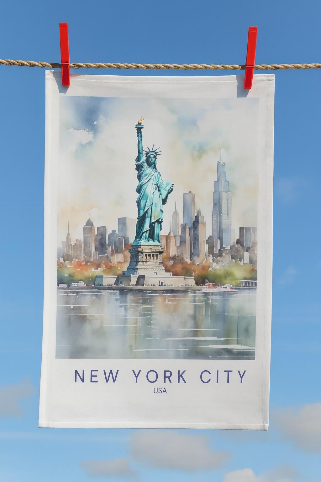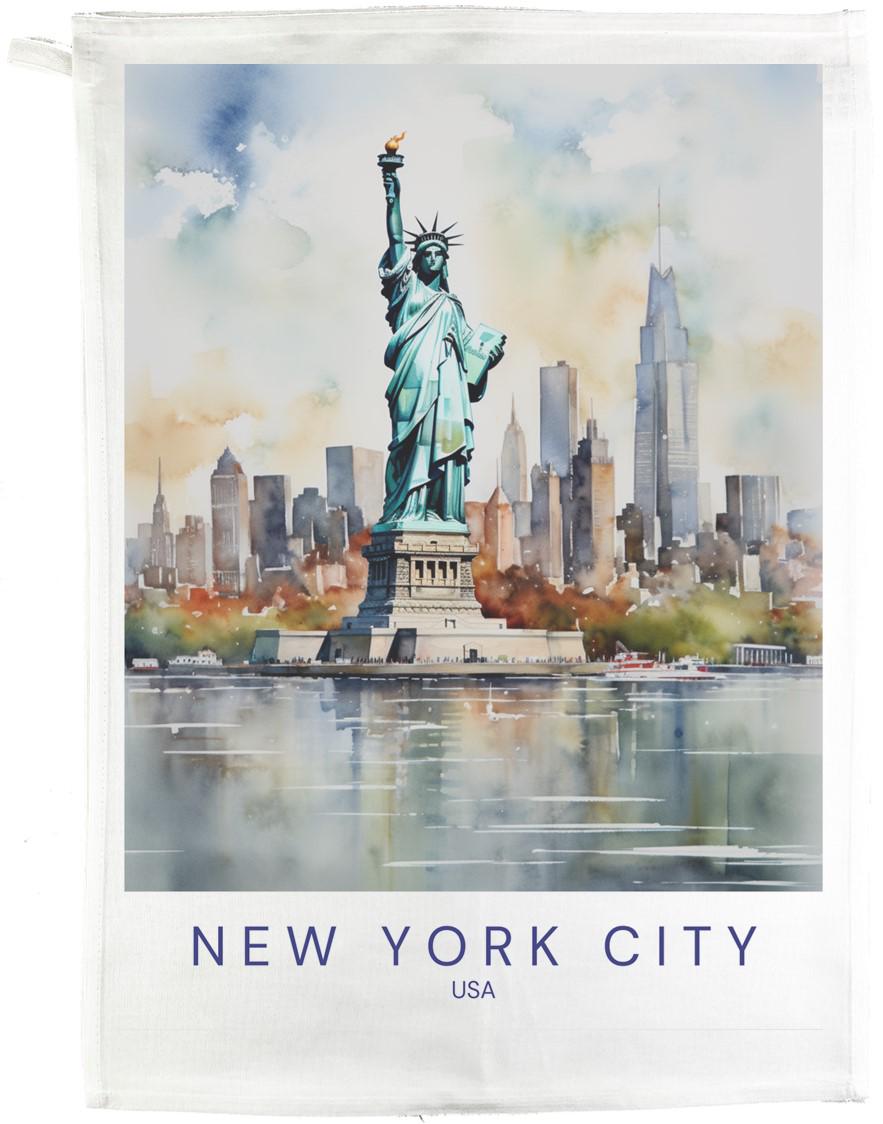 This charming New York City cotton tea towel brings a touch of iconic American style to your kitchen. Featuring a beautiful watercolour-style design of the Statue of Liberty against the Manhattan skyline, this tea towel celebrates one of the world's most recognisable cities. Made from 100% cotton with a plain weave construction and weighing 185 grams per square metre, it offers excellent absorbency and durability for everyday use. The rectangular towel measures 47 x 65 centimetres, providing ample coverage for drying dishes, glassware, and cookware. Its vintage travel poster aesthetic makes it a decorative accent piece when not in use, perfect for adding character to your kitchen décor. The tea towel includes a convenient hanging loop for easy storage and features white-only chlorine bleach instructions for maintaining its crisp appearance. Suitable for machine washing at 40 degrees, this practical kitchen essential combines functionality with artistic flair. Whether you're a New York enthusiast, a collector of travel-themed homewares, or simply looking for a quality tea towel, this piece makes an excellent addition to any home.