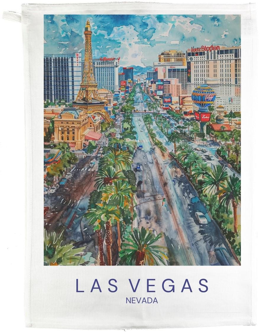 This charming Las Vegas cotton tea towel brings a touch of vintage travel poster style to your kitchen. Measuring 47 x 65 centimetres, this rectangular tea towel features a beautifully illustrated design showcasing the iconic Las Vegas Strip with its famous landmarks and palm-lined boulevards. Crafted from 100% cotton with a plain weave construction and weighing 185 grams per square metre, this tea towel offers excellent absorbency and durability for everyday use. The natural cotton fabric is soft yet hardwearing, making it perfect for drying dishes, wiping surfaces, or simply adding decorative flair to your kitchen. A convenient hanging loop allows for easy storage when not in use. The care instructions recommend washing at 40 degrees, using chlorine bleach on white only, no tumble drying, ironing as needed, and dry cleaning with perchloroethylene. This tea towel makes a wonderful gift for Las Vegas enthusiasts or anyone who appreciates vintage travel aesthetics. Whether you're a collector of destination-themed kitchen textiles or simply looking to brighten up your culinary space, this Las Vegas tea towel combines practical functionality with artistic appeal.