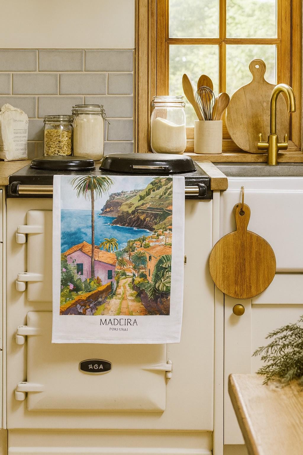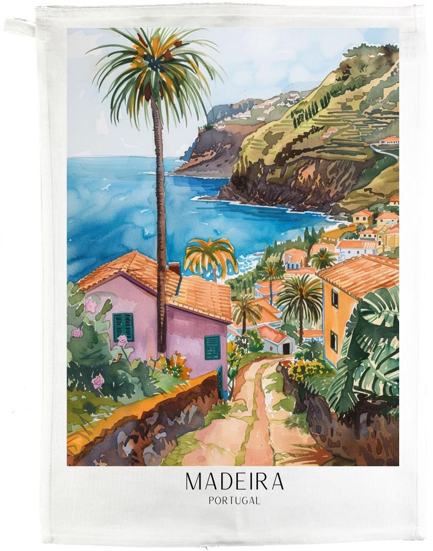 This large cotton tea towel brings a touch of Portuguese charm to your kitchen with its beautiful Madeira travel poster design. Measuring 47 x 65 centimetres, this generously sized tea towel provides ample coverage for drying dishes, glassware, and cookware whilst adding a decorative accent to your home. Crafted from 100% cotton with a plain weave construction and weighing 185 grams per square metre, this tea towel offers excellent absorbency and durability for everyday use. The natural cotton fabric is gentle on delicate surfaces and becomes softer with each wash. Featuring a convenient hanging loop for easy storage, this rectangular tea towel showcases a vintage travel poster style illustration of Madeira's stunning coastal landscape, complete with colourful houses, palm trees, and terraced hillsides overlooking the azure sea. The white background allows the vibrant artwork to stand out beautifully in any kitchen setting. Machine washable at 40 degrees, this tea towel is designed for practical daily use whilst maintaining its attractive appearance. Whether you're looking to add Mediterranean flair to your kitchen or searching for a thoughtful gift for travel enthusiasts, this Madeira tea towel combines functionality with artistic appeal.