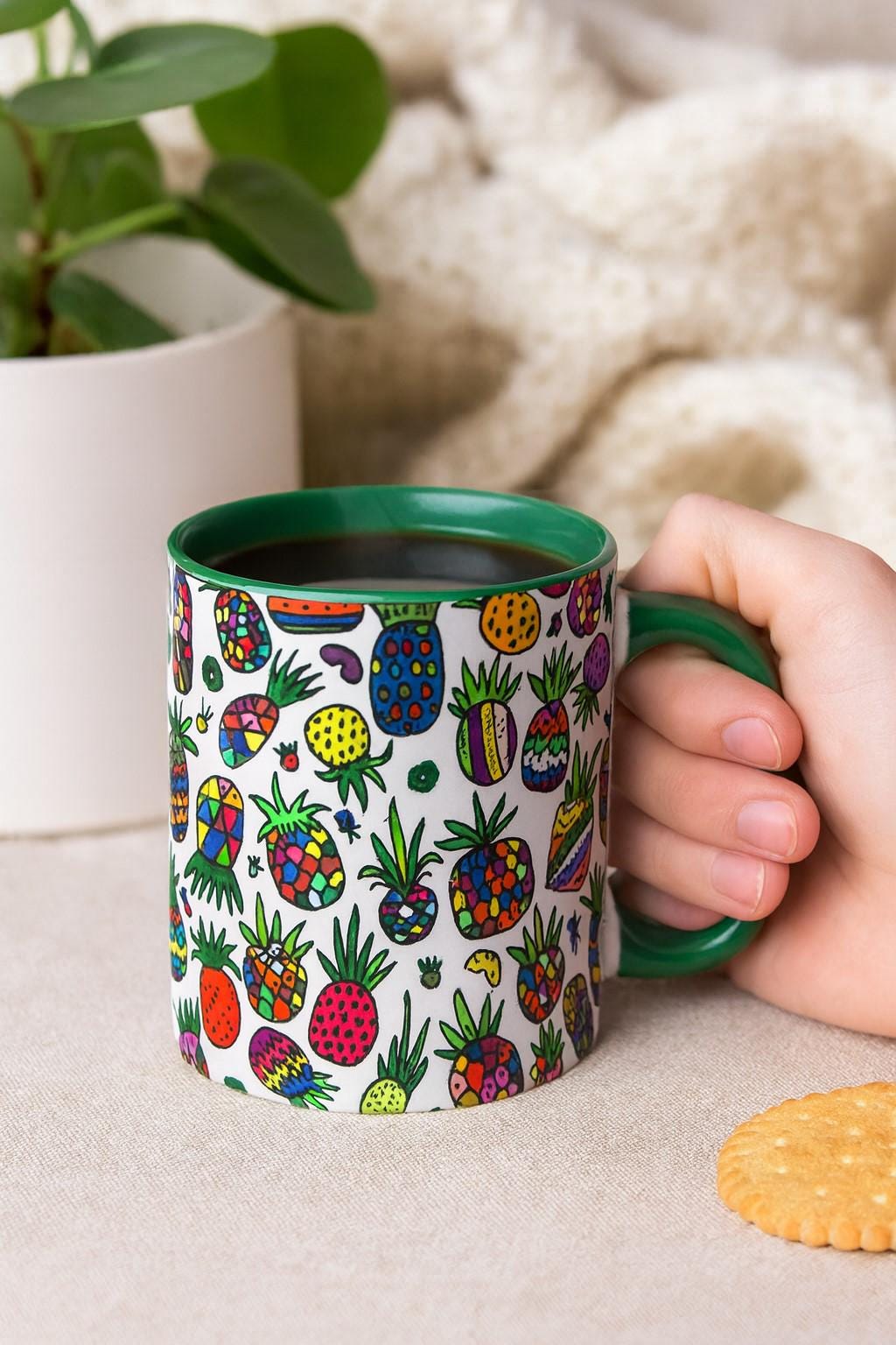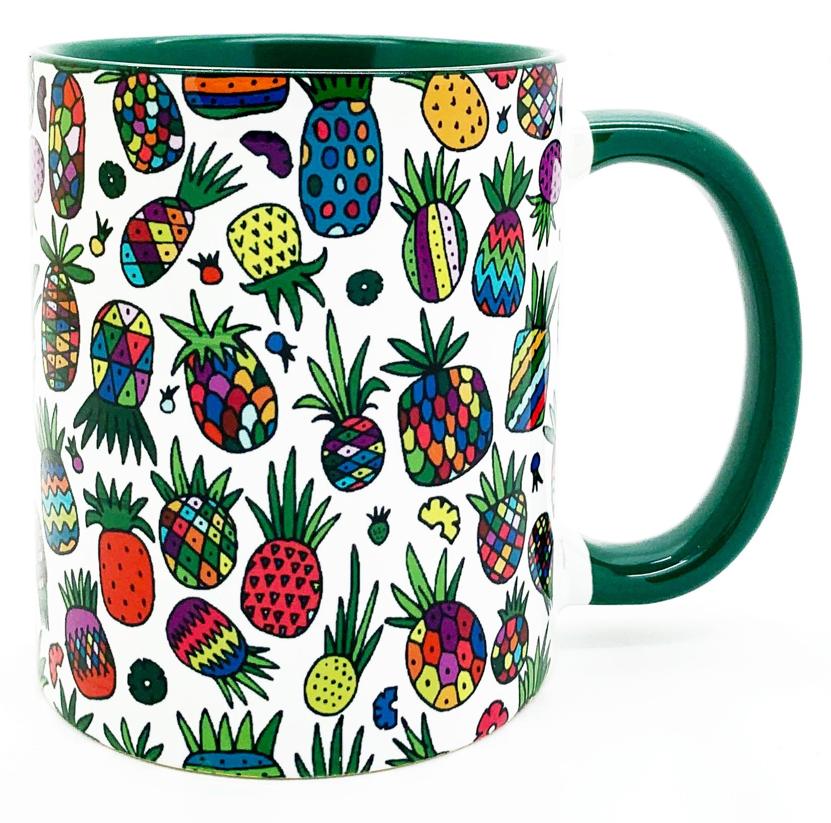 This charming ceramic mug features a vibrant colourful pineapple design that brings a tropical touch to your daily beverage routine. The mug is crafted with a distinctive green glazed interior and handle, creating an eye-catching contrast with the exterior pattern. Designed as a drinking cup, this piece combines functionality with playful aesthetics, making it suitable for enjoying your favourite hot or cold beverages. The unique pineapple motif adds a cheerful element to your kitchen collection or makes for a delightful gift option.