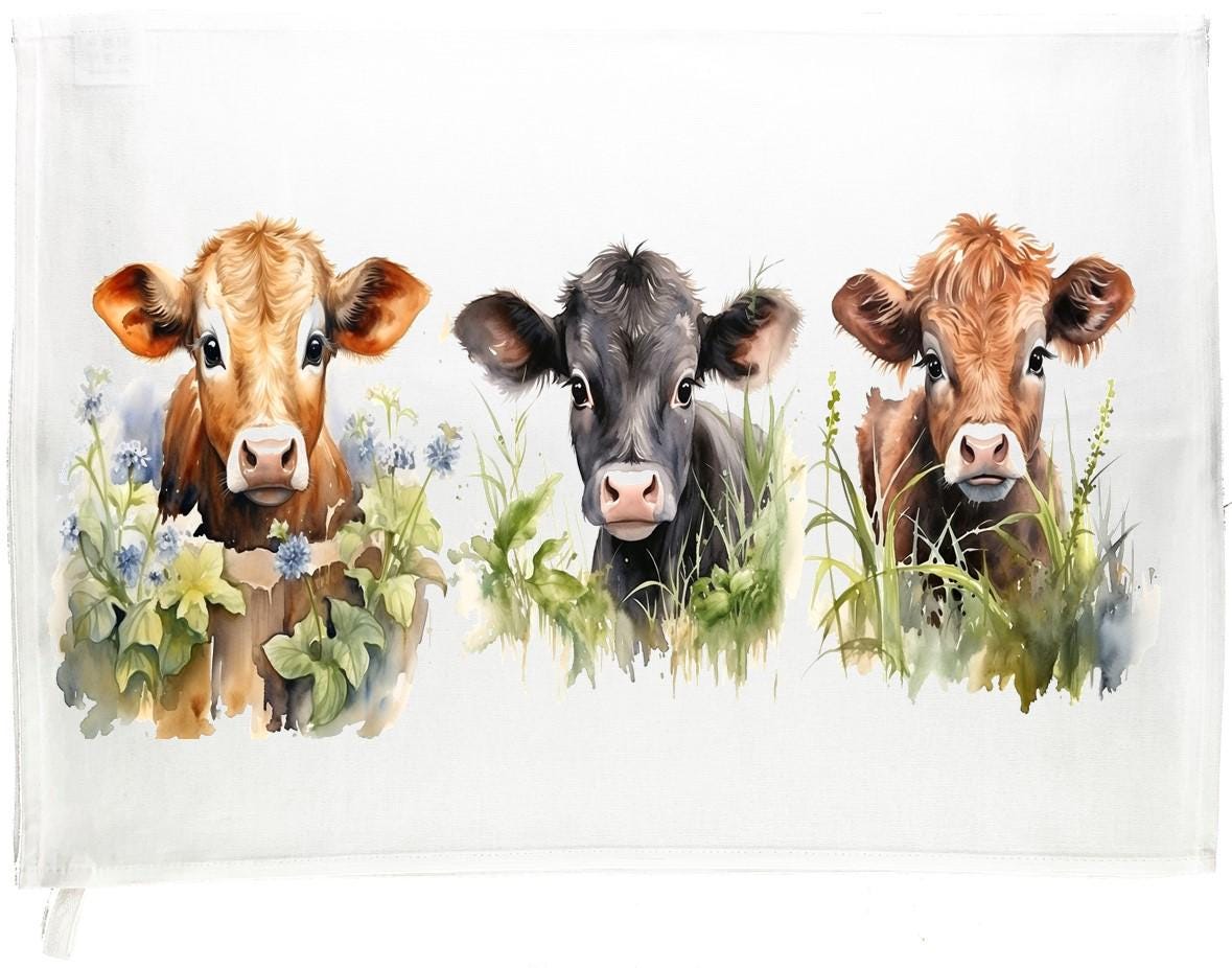 This large cotton tea towel brings a touch of pastoral charm to your kitchen with its delightful watercolour illustration of three cows surrounded by wildflowers and meadow grasses. Measuring 65 x 47 centimetres, this generously sized tea towel provides ample coverage for drying dishes, covering rising dough, or protecting your hands from hot cookware. Crafted from 100% cotton with a plain weave construction at 185 grams per square metre, this tea towel offers excellent absorbency whilst remaining lightweight and quick-drying. The natural cotton fabric is gentle on delicate glassware and crockery, making it ideal for everyday kitchen tasks. The rectangular design features a convenient hanging loop for easy storage when not in use. Care is straightforward with machine washing at 40 degrees, though bleaching and tumble drying should be avoided to preserve the charming artwork. This tea towel combines practical functionality with decorative appeal, making it a lovely addition to any country-style or farmhouse kitchen, or a thoughtful gift for animal lovers and those who appreciate rustic home décor.