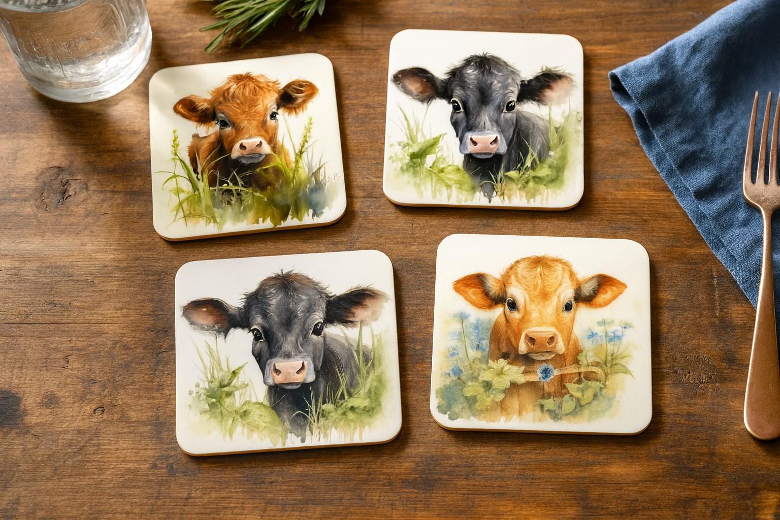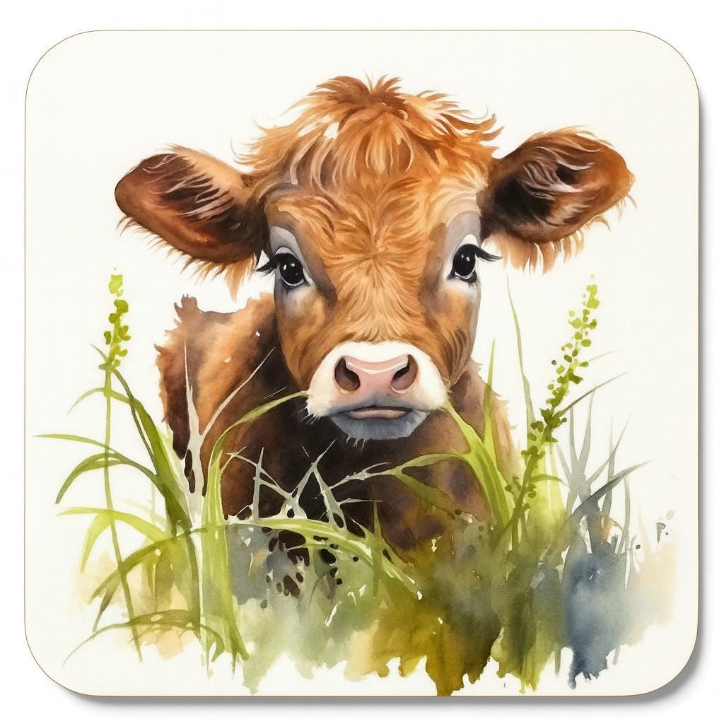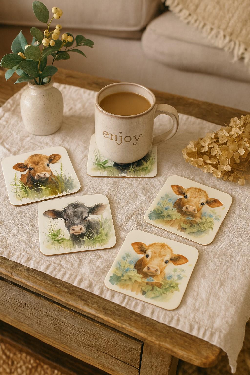 Add a touch of rustic charm to your home with these adorable watercolour calf coasters. Each coaster features a sweet, expressive calf illustrated in soft, natural tones and surrounded by gentle greenery or florals. The style brings warmth and personality to your table while protecting surfaces from spills and heat. Measuring 9.3 x 9.3cm, these square coasters are perfectly sized to accommodate cups, mugs, and glasses. The cork backing provides a non-slip grip whilst protecting your furniture surfaces from heat marks, water rings, and scratches. Whether you're entertaining guests or enjoying a quiet cuppa, these peacock coasters add a sophisticated accent to your coffee table, dining table, or desk.
