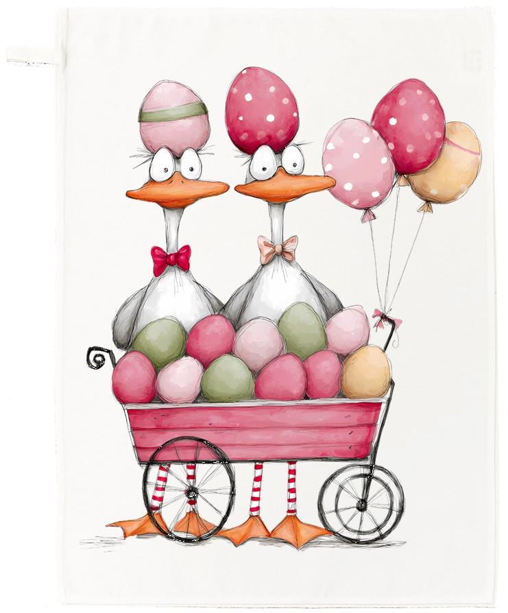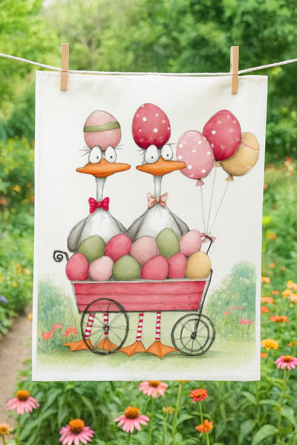 This charming Easter ducks tea towel brings a touch of whimsical delight to your kitchen this spring season. Featuring an adorable illustrated design of cheerful ducks with colourful Easter eggs and balloons, this tea towel adds a playful atmosphere to your home. Crafted from 100% cotton with a plain weave construction, it offers excellent absorbency and durability for everyday kitchen tasks. Measuring 65 x 47 centimetres, this rectangular tea towel provides ample coverage for drying dishes, covering baked goods, or simply displaying as decorative kitchen décor. The vintage-inspired illustration showcases delightful characters in soft pastel hues, perfect for Easter celebrations or year-round cottagecore charm. Machine washable at 40°C for easy care and maintenance, this tea towel combines practicality with personality. Whether you're looking to refresh your kitchen linens for the holiday season or searching for a thoughtful gift for Easter enthusiasts, this whimsical tea towel makes a delightful addition to any home.