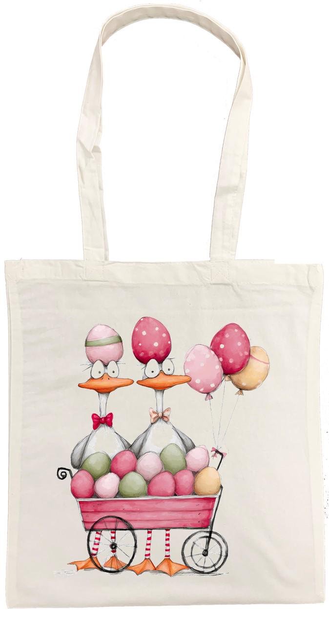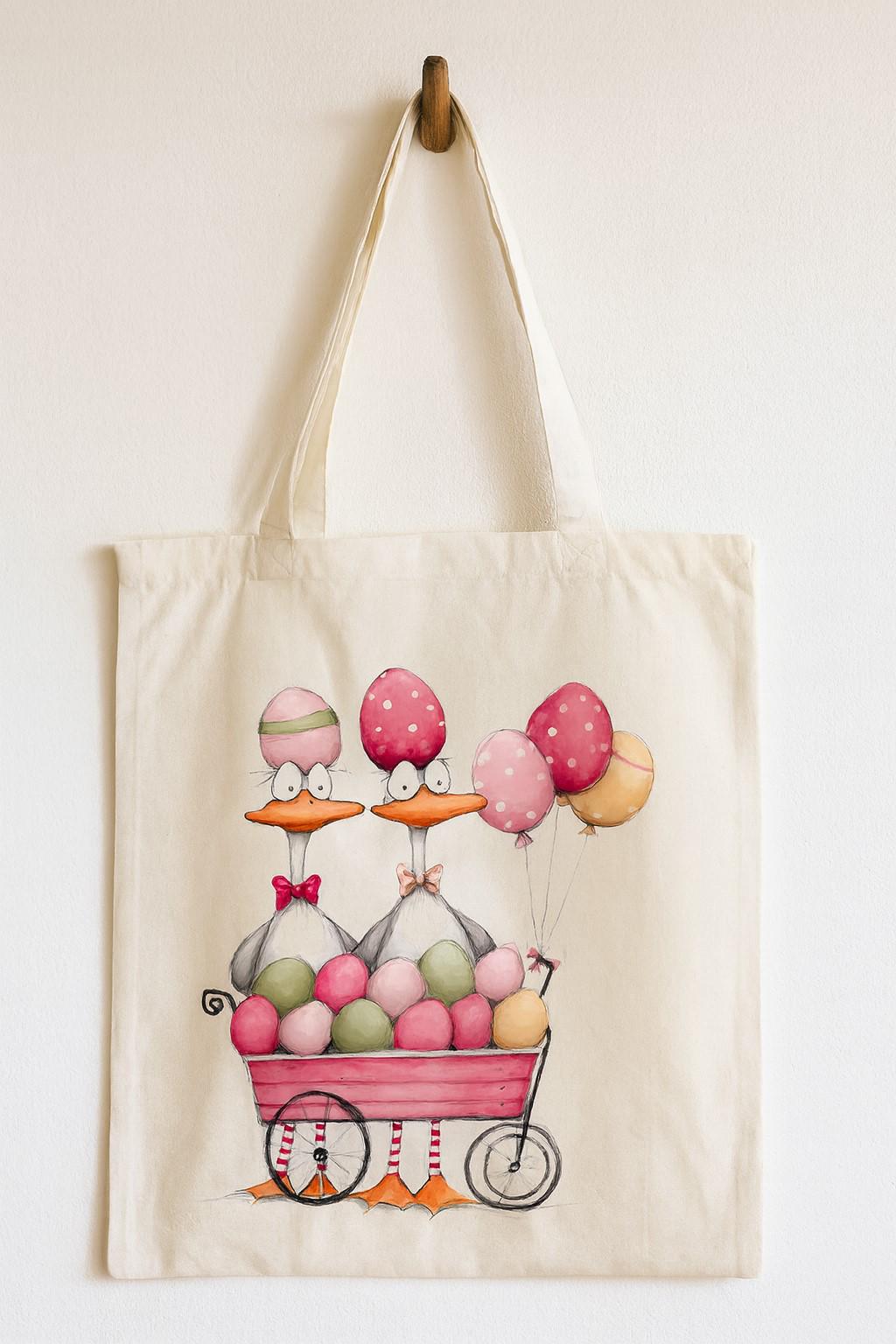 This charming cotton tote bag features a delightful Easter-themed design with whimsical ducks and colourful eggs, printed on both sides for maximum visual appeal. Crafted from 100% cotton, this lightweight yet durable bag measures 42 x 38 centimetres, providing ample space for your shopping, books, or everyday essentials. The comfortable cotton handles make it easy to carry, whether you're heading to the market, the beach, or simply running errands around town. The playful artistic design showcases adorable ducks with egg-topped heads, surrounded by a wagon full of pastel-coloured Easter eggs and festive balloons, making it perfect for spring celebrations or year-round use by those who appreciate quirky, fun accessories. This unisex tote bag is suitable for adults and offers a practical, reusable alternative to disposable bags. Please note that this version features an open-top design with no zip closure or pockets. Care is simple: machine wash at 30 degrees Celsius, do not tumble dry, and iron on the reverse side to preserve the vibrant print. A delightful accessory that combines functionality with festive charm.
