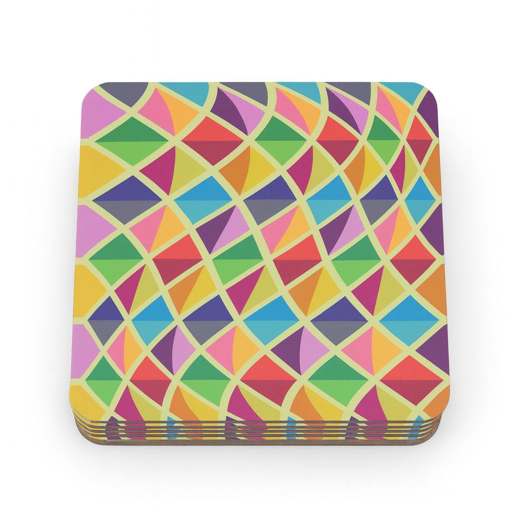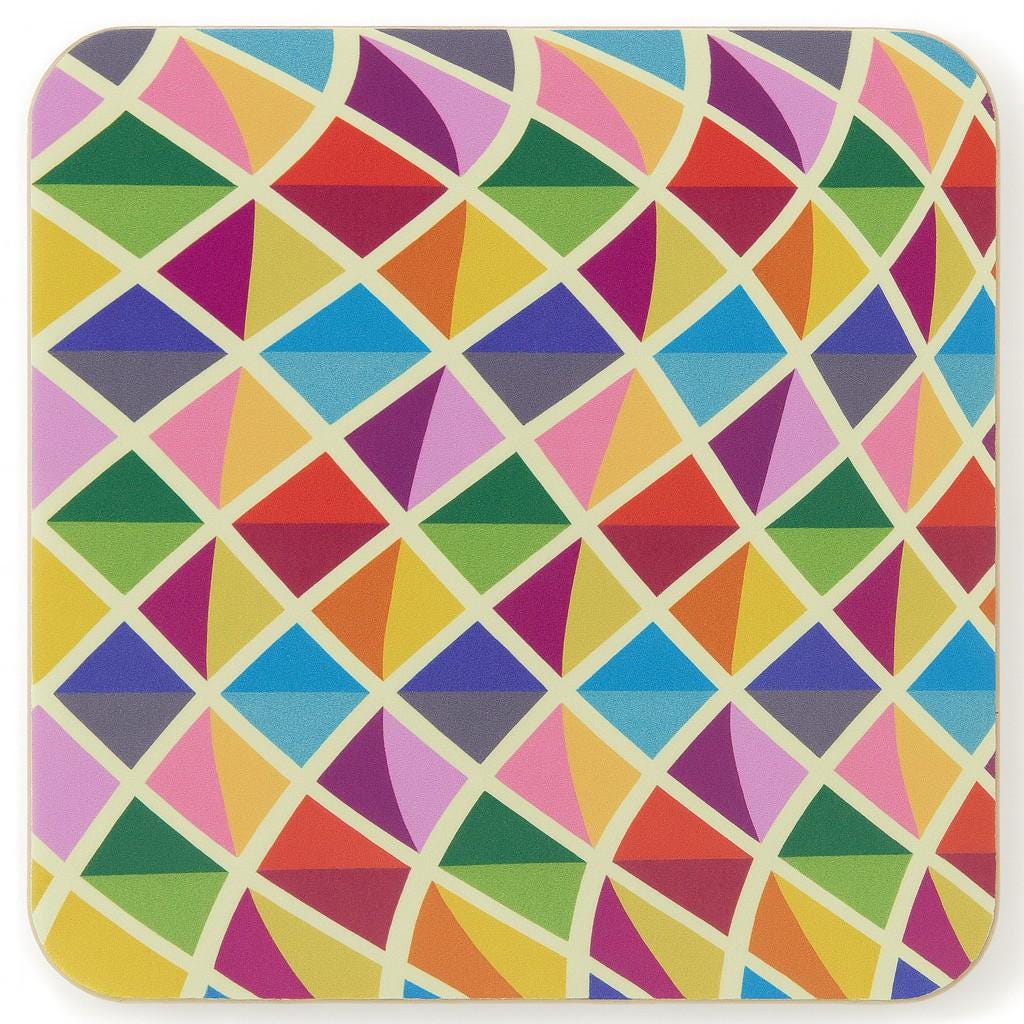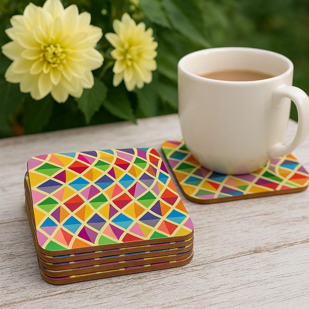 Brighten up your home with this stunning Kaleidoscope set of coasters from Half a Donkey. Featuring a vibrant, eye-catching geometric pattern bursting with a full spectrum of colours — including blue, teal, gold, green, yellow, and purple — these coasters are sure to add a cheerful, artistic touch to any table setting. The bold triangular mosaic design creates a mesmerising kaleidoscope effect that is both modern and playful, making them a wonderful conversation starter when entertaining guests. Each coaster measures 9.5 x 9.5 cm and is finished with a cork backing to protect your surfaces from heat and moisture. The set comes with 4 coasters, giving you plenty to go around. Not dishwasher safe — simply wipe clean with a damp cloth to keep them looking their best. Whether you're treating yourself or looking for a unique and colourful gift, this set is a delightful choice for anyone who loves vibrant, artistic home accessories. Proudly made in the UK.