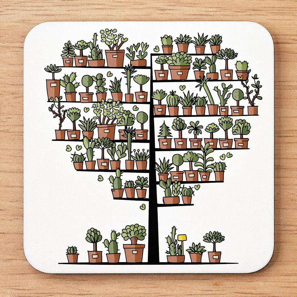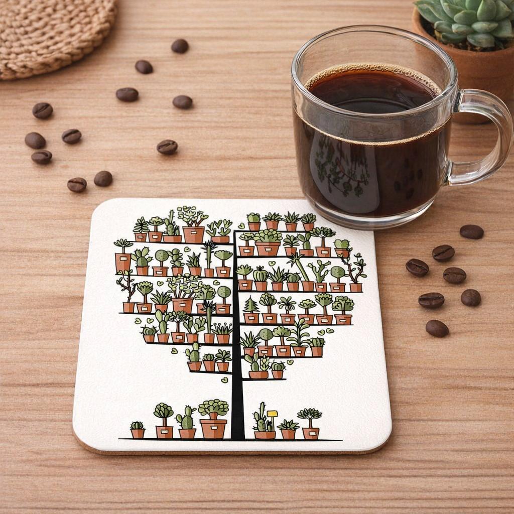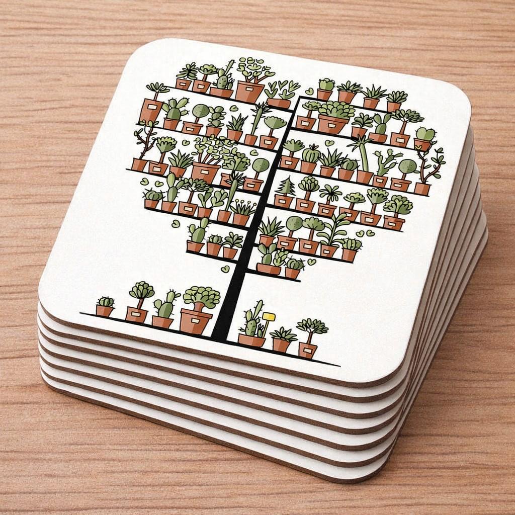 Bring a touch of botanical charm to your home with this delightful cactus tree coaster set from Half a Donkey. Each coaster features a whimsical illustration of a heart-shaped shelving unit filled with an array of charming potted cacti and succulents, making it a perfect gift for any plant lover. The set includes 4 square coasters, each measuring 9.5 x 9.5 centimetres, with a slim 0.3 centimetre profile that sits neatly on any surface. The cork backing provides a firm, non-slip grip to protect your tables and worktops from scratches and water rings. The vibrant printed finish ensures the design stays crisp and eye-catching. These coasters are not dishwasher safe — simply wipe clean with a damp cloth to keep them looking their best. Whether displayed in a kitchen, living room, or home office, this charming set adds a playful, nature-inspired accent to your décor. Made in the UK.
