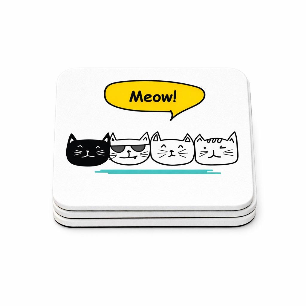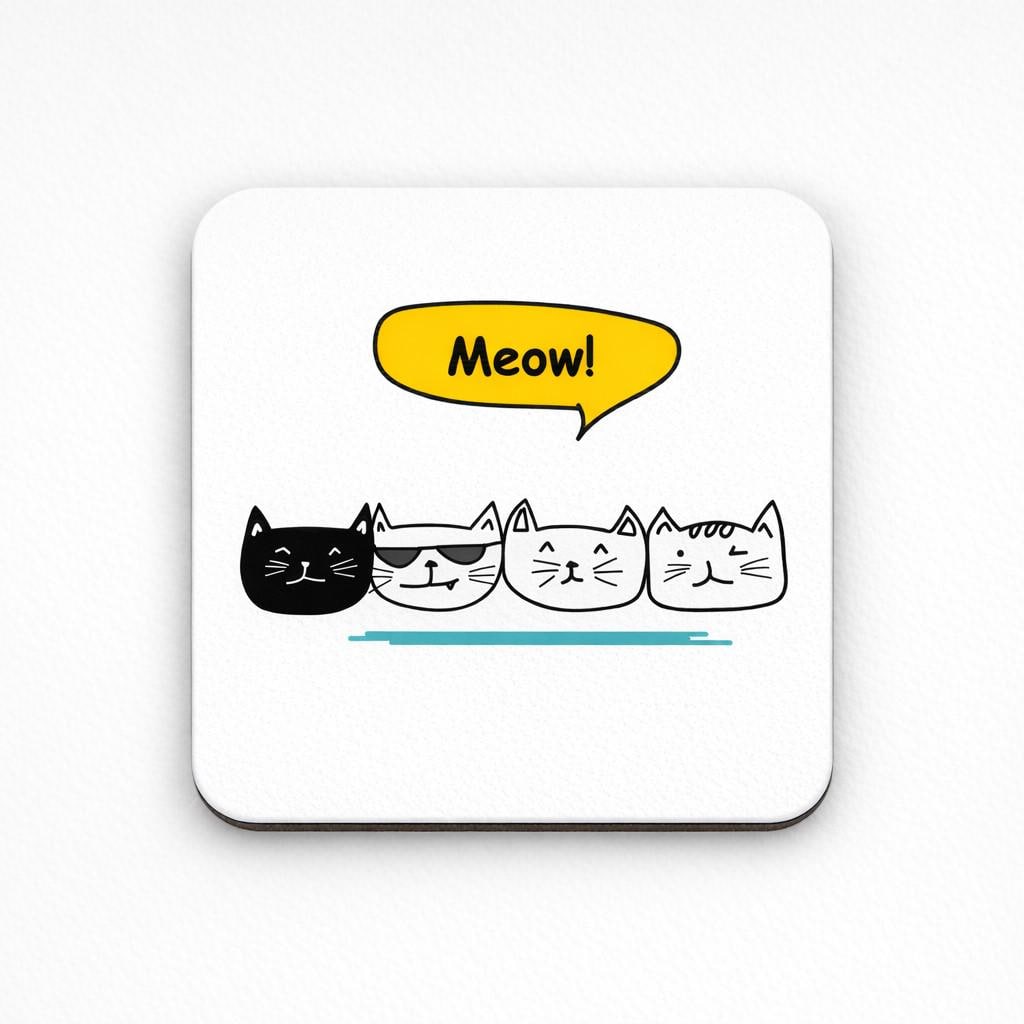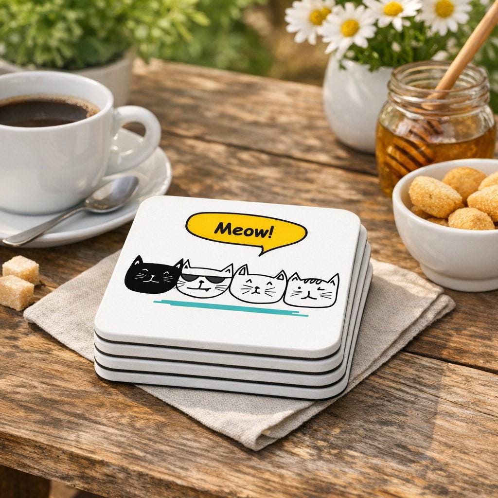 Brighten up your home with these charming Meow Cat Drink Coasters, sold as a set of four. Each coaster features a delightful illustration of four quirky cat faces — including a cool black cat and a white cat sporting sunglasses — alongside a bold yellow speech bubble exclaiming "Meow!". The clean white background and teal accent stripe give the design a fresh, modern feel that is sure to raise a smile. The square shape with softly rounded corners offers a contemporary look that suits a variety of home décor styles. Each coaster is cork backed, providing a firm, stable grip on surfaces and helping to protect your tables and countertops from scratches and moisture rings. Whether you are enjoying your morning coffee indoors or relaxing outside in the garden, these coasters are a practical and playful addition to any setting. They also make a wonderful gift for cat lovers. The set of four ensures you have plenty on hand for guests. Please wipe clean with a damp cloth rather than submerging in water.