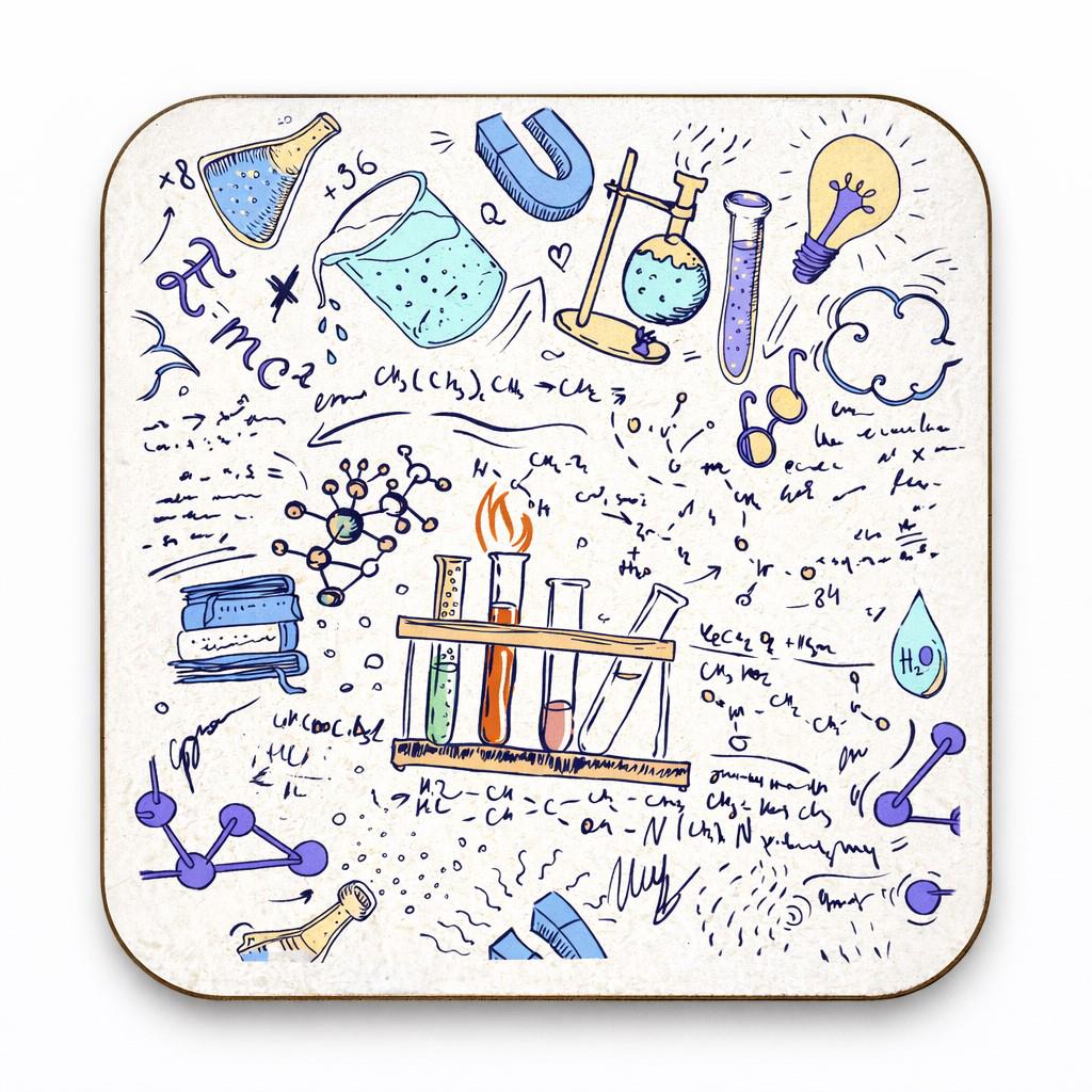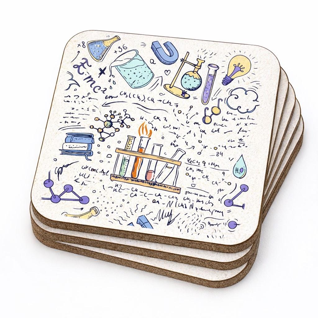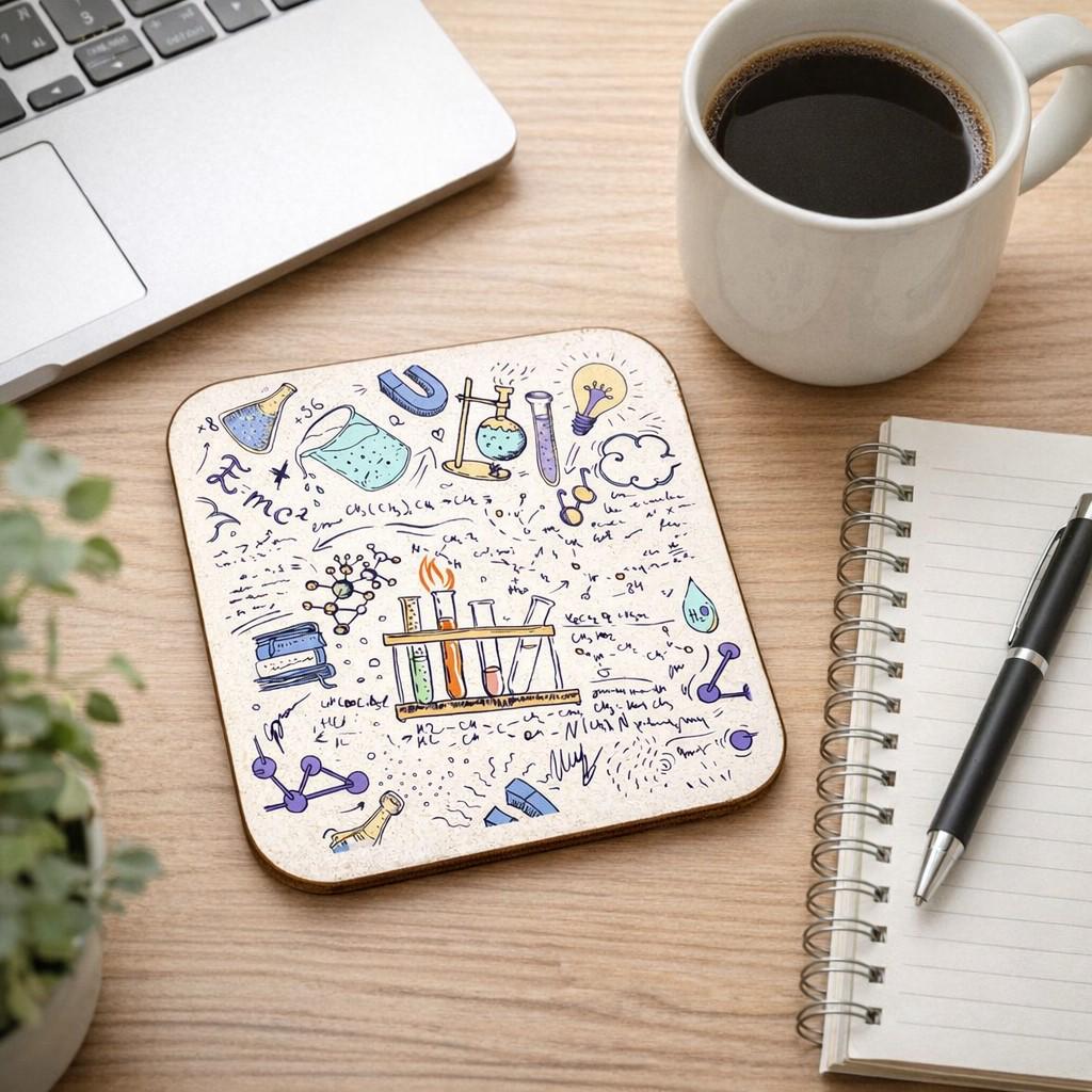 Bring a touch of scientific curiosity to your home or office with these charming chemistry lab cork-backed coasters from Half a Donkey. Sold as a set of 6, each square coaster measures 9.5 x 9.5 centimetres and features a vibrant, hand-drawn style illustration packed with laboratory imagery — think beakers, test tubes, molecular structures, Bunsen burners, and scribbled equations including the iconic E=mc². The colourful artwork spans a delightful palette of blue, teal, gold, green, yellow, and purple, making these coasters a wonderful conversation starter. The cork backing provides a sturdy, non-slip base that protects your surfaces from heat and moisture, while the printed top surface is easy to maintain — simply wipe clean with a damp cloth. Not dishwasher safe. These coasters make a brilliant gift for science enthusiasts, students, teachers, or anyone who appreciates quirky, intelligent design. Made in the UK with care and attention to detail, they are equally at home on a desk beside a laptop or on a coffee table in the living room.