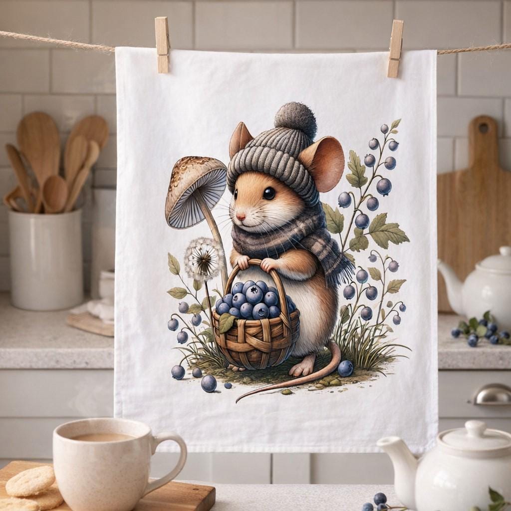 Bring some charm to your kitchen with this delightful tea towel from Half a Donkey, featuring an enchanting illustrated mouse amidst toadstools and woodland foliage, with his basket of blueberries. The intricate, storybook-style artwork makes this a truly unique addition to any home. Crafted from 100% cotton in a plain weave, this generously sized tea towel measures 67 x 45cm and comes with a convenient hanging loop for easy storage or display. It offers a satisfyingly substantial feel whilst remaining practical for everyday kitchen use. The crisp white background allows the charming printed illustration to truly shine. Machine washable at 40°C, it is easy to care for and built to last. Whether you are treating yourself or searching for a thoughtful gift for a nature lover, music enthusiast, or anyone who appreciates whimsical illustrated homewares, this tea towel is sure to delight. It arrives in standard packaging, ready to gift or display straight away.