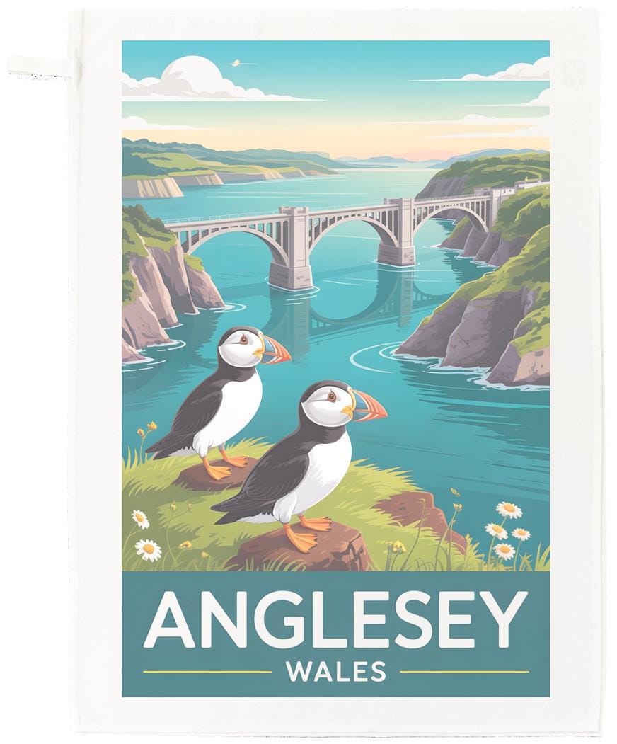 Large cotton tea towel with the Anglesey printed on it. Bring a touch of coastal charm into your kitchen with this beautifully illustrated Anglesey, Wales tea towel. Featuring two adorable puffins perched on a wildflower‑dotted cliffside with the iconic Menai Bridge in the background, this design captures the serene beauty and wildlife of the Welsh coastline. The vibrant colours and vintage‑inspired travel‑poster style make it a standout piece for everyday use or display. Crafted from high‑quality, absorbent fabric, this tea towel is perfect for drying dishes, lining bread baskets, or adding a cheerful decorative accent to your home. It also makes a thoughtful gift for nature lovers, bird enthusiasts, travellers, or anyone with a soft spot for Wales. The tea towel is machine washable, with hanging loop and measures 67 x 45cm.