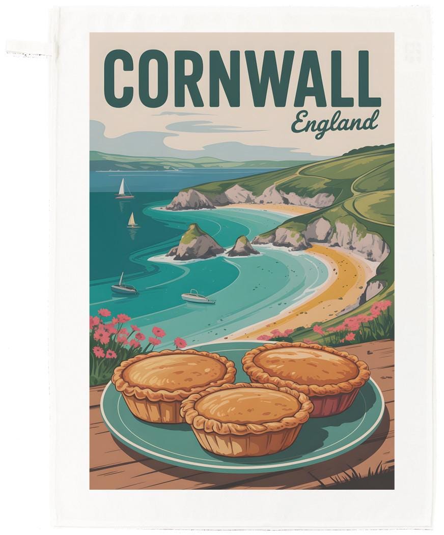 Large cotton tea towel with Cornwall printed on it. Bring the charm of the English seaside into your kitchen with this beautifully illustrated Cornwall England Tea Towel. Designed in the style of a vintage travel poster, it captures the region’s iconic coastal cliffs, turquoise waters, and classic Cornish pasties in a warm, nostalgic palette. Dramatic cliffs, rolling green hills, and sailboats drifting across a bright blue sea create a cheerful, uplifting kitchen accent. Finishing with a trio of traditional pasties in the foreground adds a playful nod to Cornwall’s beloved local cuisine. The tea towel is machine washable, with hanging loop and measures 67 x 45cm.