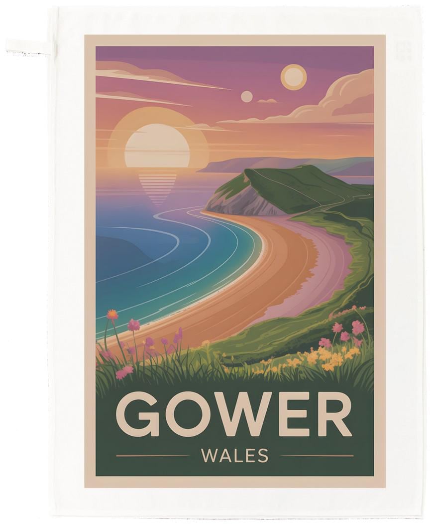 Large cotton tea towel with Gower, Wales printed on it. Bringing a touch of wanderlust into your kitchen with this beautifully designed Gower, Wales tea towel, featuring a vibrant coastal landscape inspired by classic travel posters. Whether you’re drying dishes, styling a cosy kitchen corner, or gifting a little piece of Wales, this towel adds instant charm and colour. The Gower Peninsula in South Wales, designated the UK's first Area of Outstanding Natural Beauty in 1956, is a stunning 19-mile stretch famous for dramatic limestone cliffs, sandy beaches, and surfing. Key spots include Rhossili Bay, Three Cliffs Bay, and Oxwich Bay, offering top-tier walking, wildlife, and coastal views. The tea towel is machine washable, with hanging loop and measures 67 x 45cm.