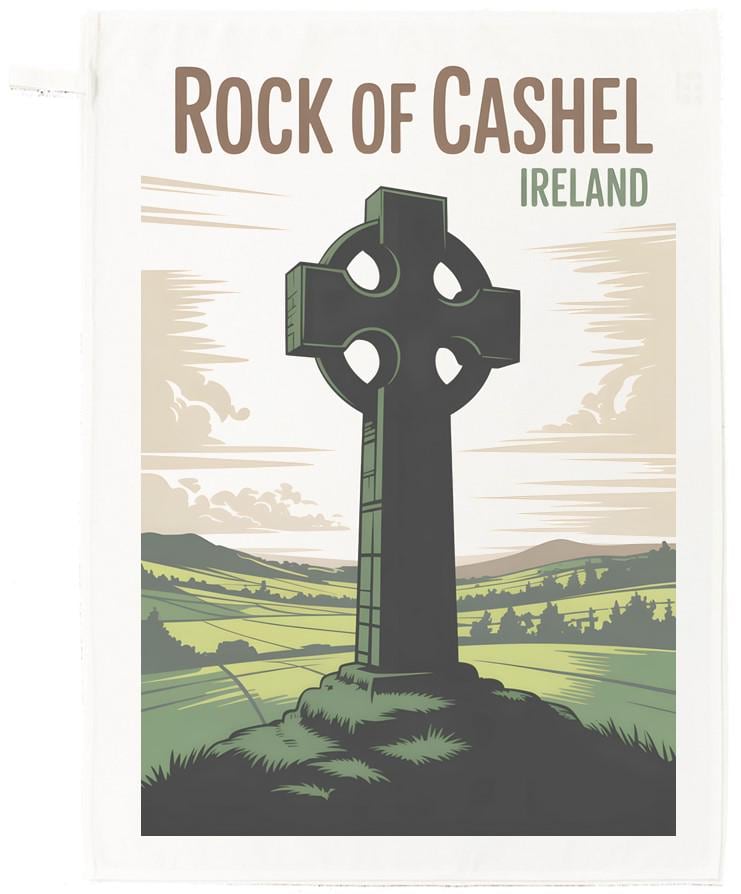 Large cotton tea towel with the Rock of Cashel printed on it. Bringing a touch of Irish heritage into your home with this beautifully illustrated Rock of Cashel Tea Towel. Featuring a vibrant, stylized depiction of the iconic Celtic cross monument set against rolling green hills and dramatic skies, this towel blends artistry with everyday practicality. he Rock of Cashel, also known as Cashel of the Kings and St. Patrick's Rock, is a historical site located dramatically above a plain at Cashel, County Tipperary, Ireland. The tea towel is machine washable, with hanging loop and measures 67 x 45cm.