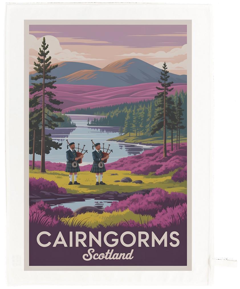 Large cotton tea towel with Cairngorms, Scotland printed on it. Bringing the beauty of the Scottish Highlands into your home with this stunning Cairngorms‑inspired tea towel. Featuring a colourful illustrated landscape complete with rolling hills, pine forests, heather fields, and traditional bagpipers, it captures the spirit and scenery of one of Scotland’s most iconic regions. The Cairngorms are a mountain range in the eastern Highlands of Scotland closely associated with the mountain Cairn Gorm. The Cairngorms became part of Scotland's second national park on 1 September 2003. The tea towel is machine washable, with hanging loop and measures 67 x 45cm.