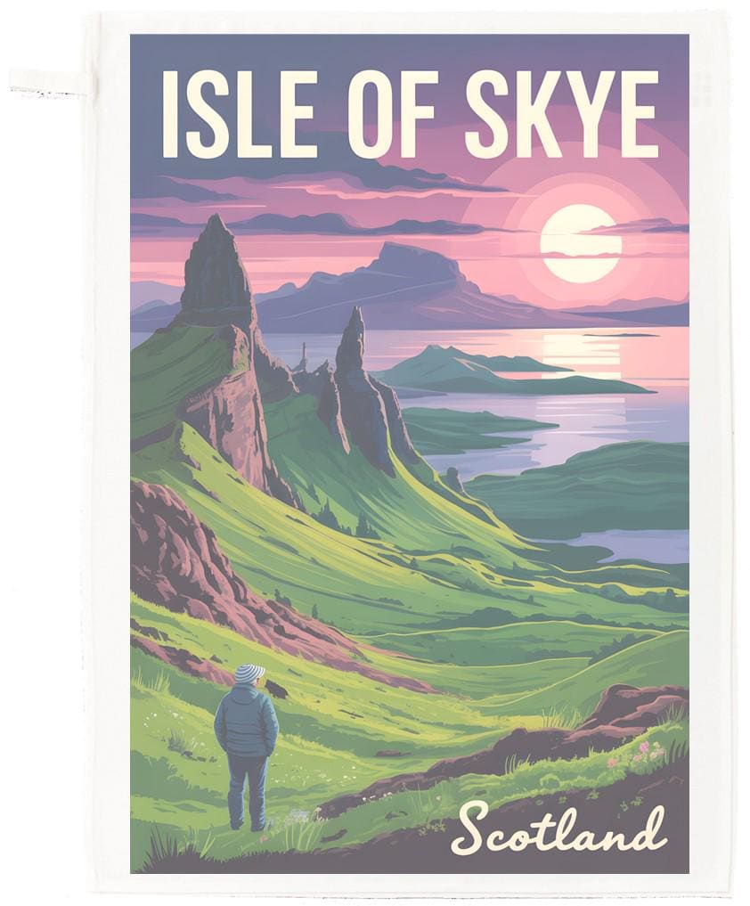 Large cotton tea towel with Isle of Skye, Scotland printed on it. Bringing the beauty of Scotland’s Isle of Skye into your kitchen with this vibrant illustrated tea towel. Featuring bold green hills, dramatic rock formations, and a glowing sunset sky in rich pink and purple tones, this design captures the charm of a classic travel‑poster style landscape. It’s a striking piece that adds colour, warmth, and wanderlust to any home. Made from soft, absorbent fabric, this tea towel is perfect for everyday use—drying dishes, lining trays, or brightening your kitchen décor. It also makes a thoughtful gift for Scotland lovers, travellers, and anyone who enjoys artistic homeware. The Isle of Skye, located off Scotland's northwest coast, is the largest island in the Inner Hebrides, renowned for its dramatic, rugged landscapes, medieval castles, and rich Gaelic culture. Famous for landmarks like the Old Man of Storr, Fairy Pools, and Dunvegan Castle, it offers unparalleled hiking and wildlife viewing. Portree, featuring a colourful harbour, is the main town, while access is provided by a free road bridge and ferries. The tea towel is machine washable, with hanging loop and measures 67 x 45cm.