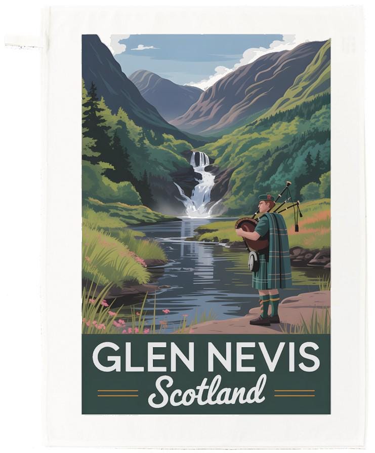 Large cotton tea towel with Glen Nevis, Scotland printed on it. Bringing a touch of Scottish charm into your kitchen with this beautifully designed cotton tea towel featuring a vintage‑style Glen Nevis travel illustration. The artwork showcases a peaceful Highland valley, cascading waterfall, and a traditional bagpiper in full Scottish attire, creating a warm, nostalgic atmosphere that feels both classic and contemporary. Glen Nevis is a spectacular Scottish glen near Fort William, featuring towering peaks, deep forests, and the rushing River Nevis. It is famously home to Ben Nevis (the UK's highest mountain) and the dramatic Steall Waterfall. Popular for outdoor activities, it offers scenic walking, cycling, fishing, and iconic film locations from Harry Potter and Braveheart. The tea towel is machine washable, with hanging loop and measures 67 x 45cm.