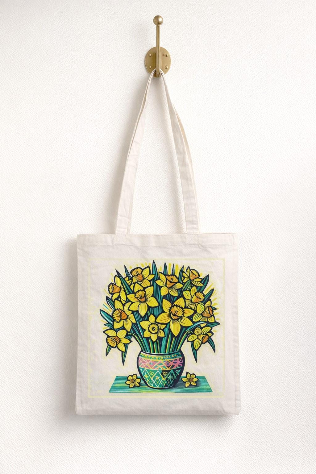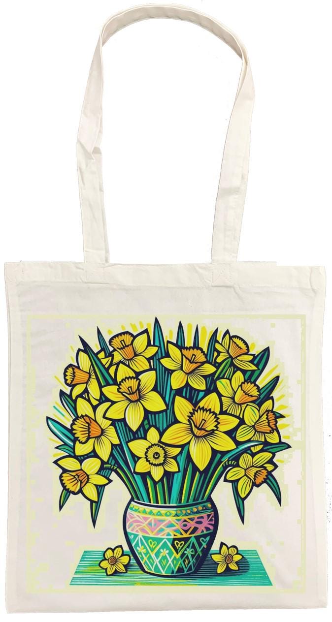 Brighten up your everyday carry with this cheerful daffodil cotton tote bag from Half a Donkey. Featuring a vibrant, eye-catching illustration of a lush bouquet of yellow daffodils arranged in a beautifully patterned vase, this bag is a true celebration of spring. The bold, colourful artwork is printed on both sides, ensuring you look just as stylish from every angle. Crafted from 100% cotton, this lightweight tote is both durable and practical, making it ideal for shopping trips, days out, or carrying your everyday essentials. The bag measures 38 x 42 centimetres with comfortable double cotton handles measuring 30 centimetres in length, offering plenty of room for all your belongings. Please note this bag has no interior pocket or zip. It is machine washable at 30 degrees Celsius — do not tumble dry, and iron on the reverse side only. A delightful gift for flower lovers and art enthusiasts alike.