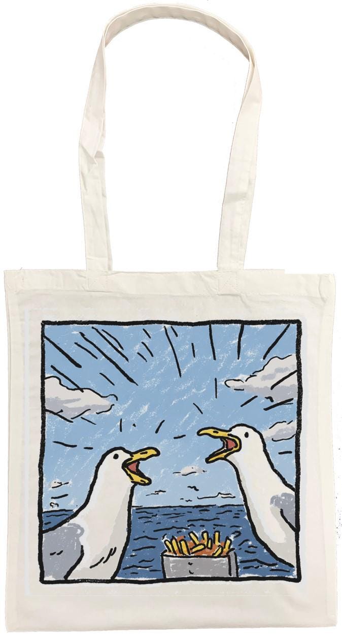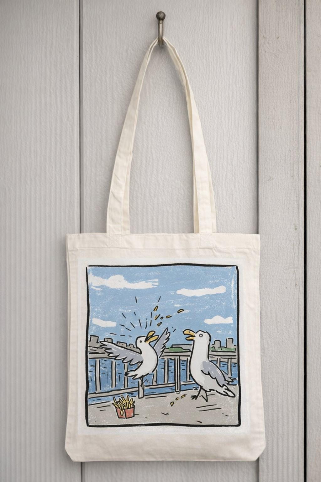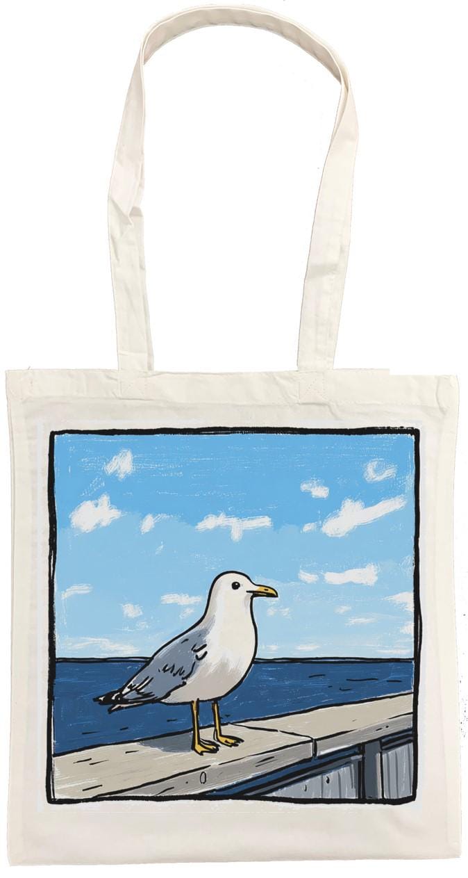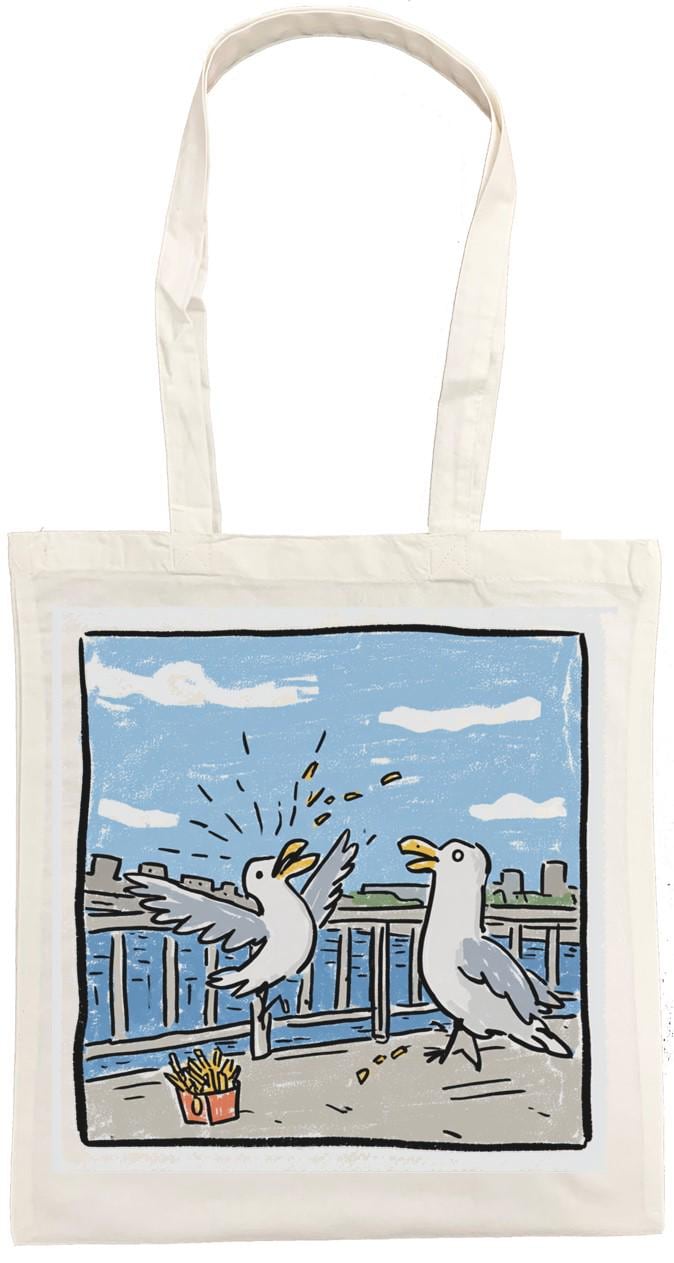 Brighten up your daily errands with this charming Pesky Seagull cotton tote bag from Half a Donkey. Featuring a vibrant, comic-style illustration of two squabbling seagulls eyeing up a portion of chips against a breezy seaside backdrop, this bag is sure to raise a smile wherever you go. Printed on both sides, the bold artwork is as eye-catching from the back as it is from the front. Crafted from 100% cotton, this lightweight yet sturdy tote measures 38 x 42 centimetres and weighs just 182 grams, making it ideal for shopping trips, beach days, or everyday use. The double cotton handles provide a comfortable carry, and the unisex design suits all styles. Machine washable at 30 degrees Celsius — simply iron on the reverse side and avoid tumble drying to keep it looking its best. Please note: this tote has no interior pocket or zip.