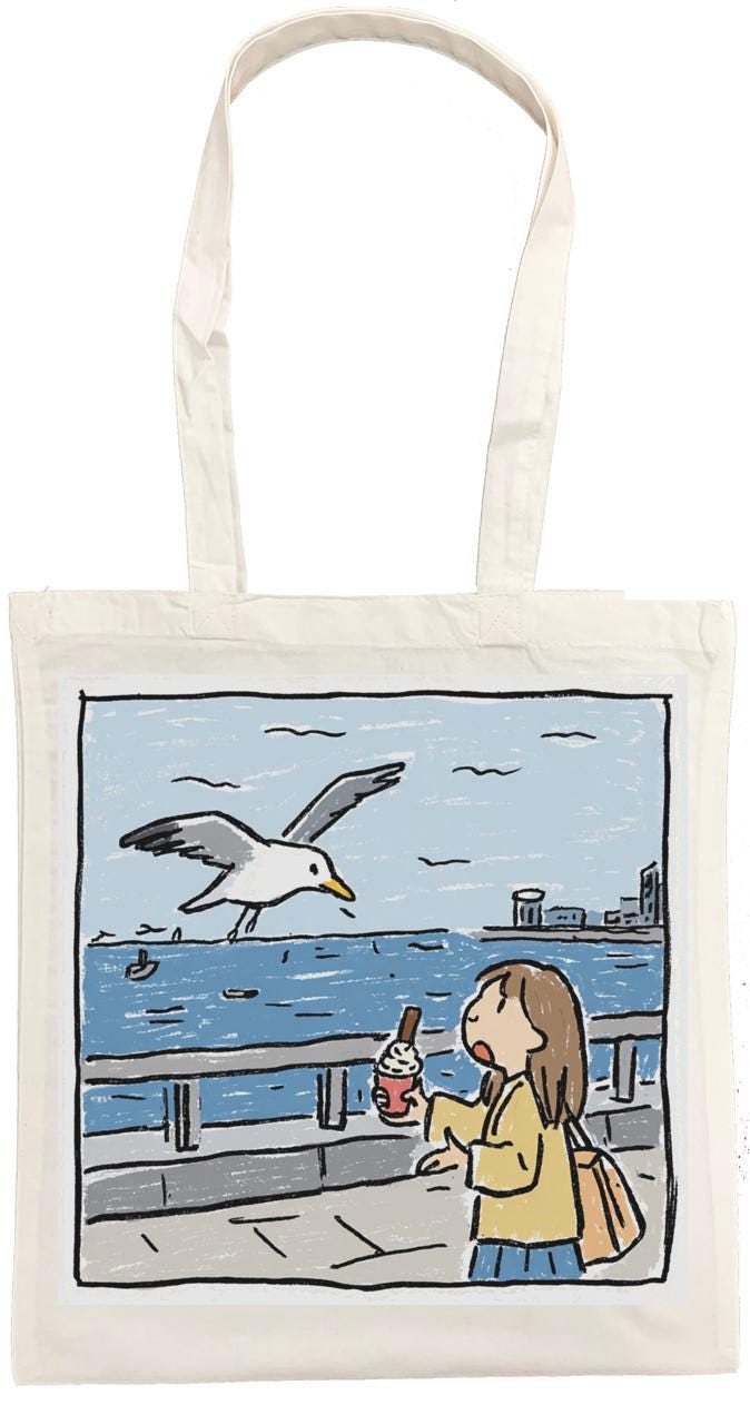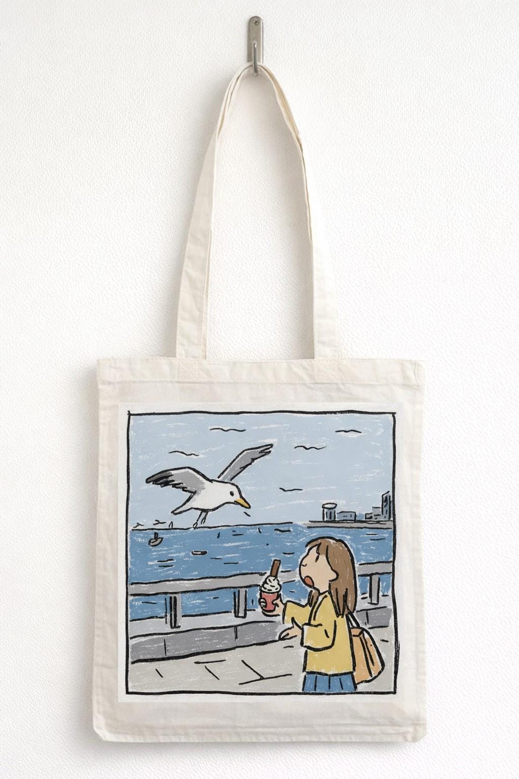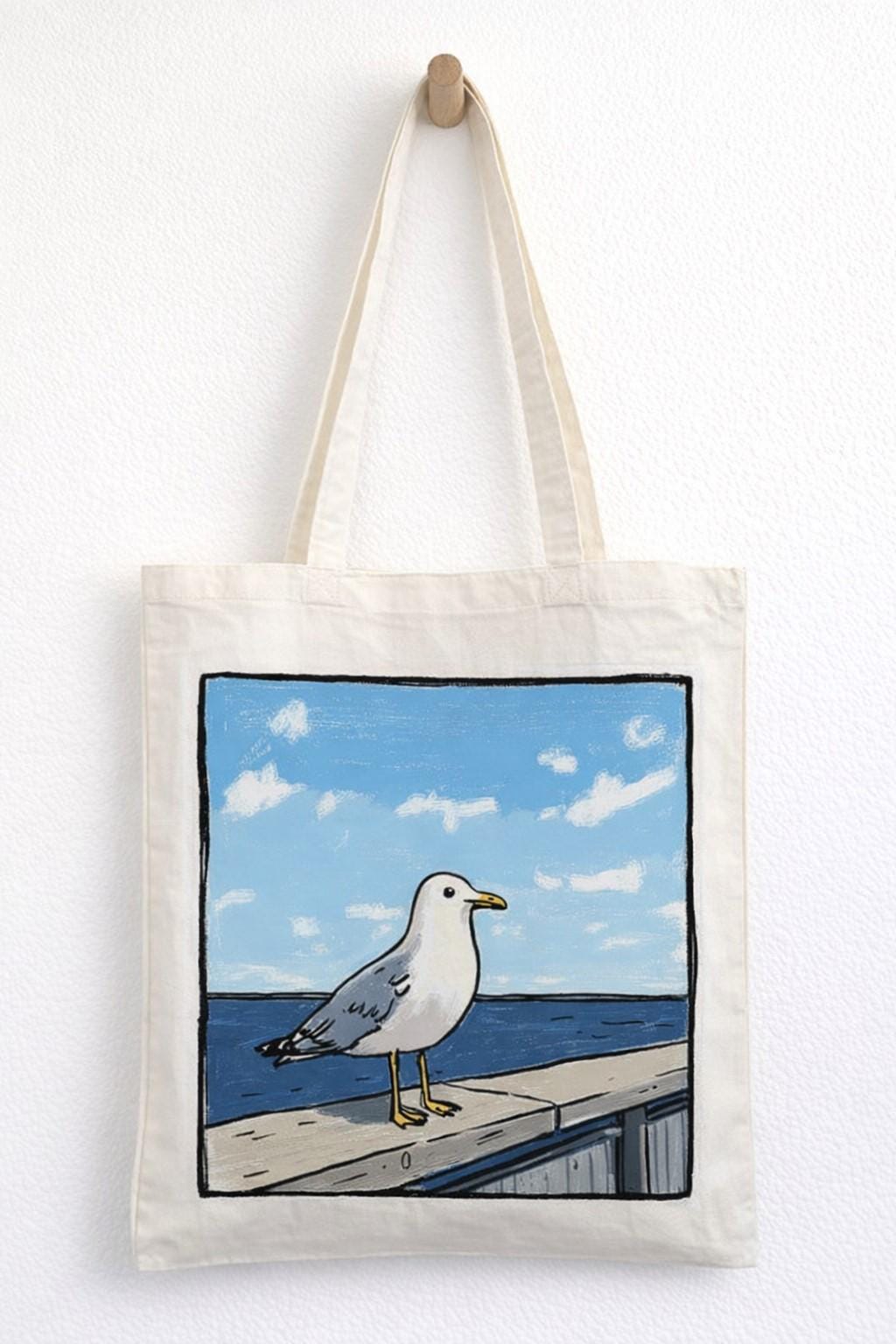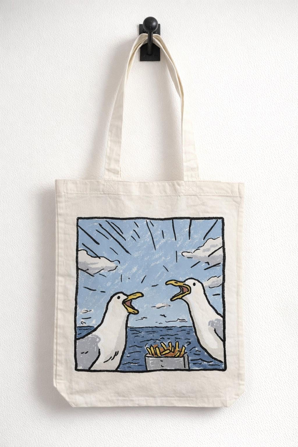 Brighten up your daily errands with this charming Pesky Seagull cotton tote bag from Half a Donkey. Featuring a vibrant, comic-style illustration of two squabbling seagulls eyeing up a portion of chips against a breezy seaside backdrop, this bag is sure to raise a smile wherever you go. Printed on both sides, the bold artwork is as eye-catching from the back as it is from the front. Crafted from 100% cotton, this lightweight yet sturdy tote measures 38 x 42 centimetres and weighs just 182 grams, making it ideal for shopping trips, beach days, or everyday use. The double cotton handles provide a comfortable carry, and the unisex design suits all styles. Machine washable at 30 degrees Celsius — simply iron on the reverse side and avoid tumble drying to keep it looking its best. Please note: this tote has no interior pocket or zip.