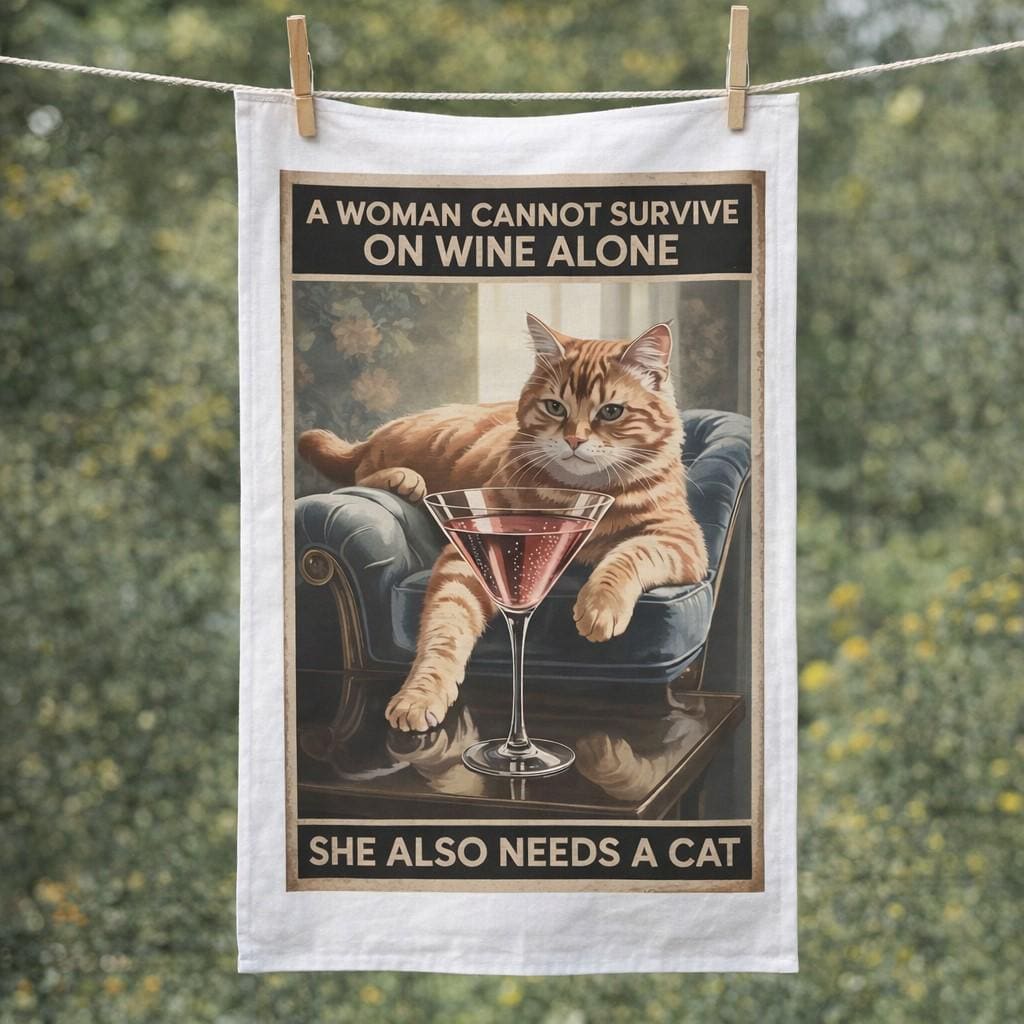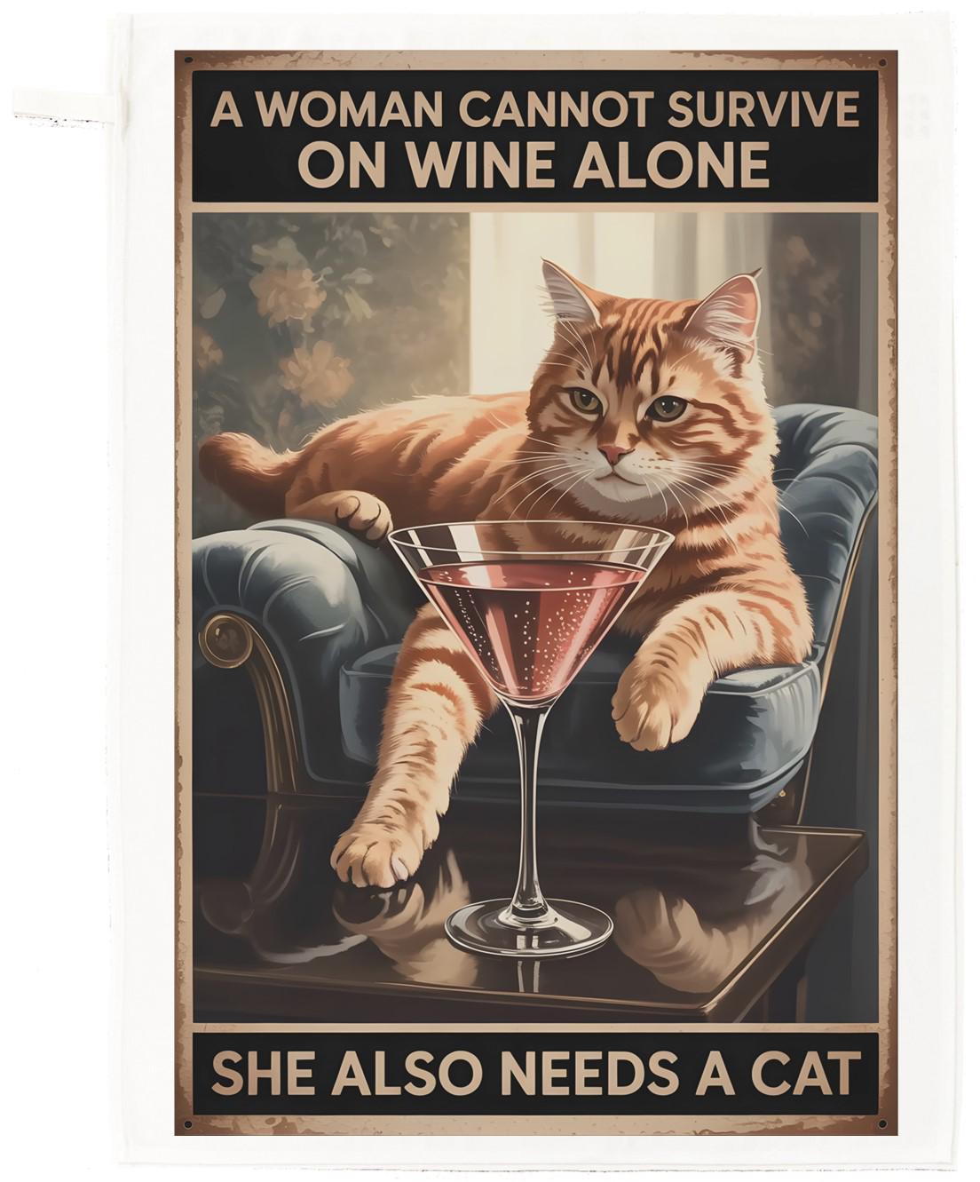 Brighten up your kitchen with this charming cat-themed tea towel from Half a Donkey. Featuring a delightfully whimsical vintage-style illustration of a laid-back ginger tabby cat lounging on a velvet armchair beside a martini glass, complete with the cheeky slogan 'A Woman Cannot Survive on Wine Alone – She Also Needs a Cat', this tea towel is sure to raise a smile. Made from 100% cotton in a plain weave, it measures a generous 65 x 47 cm, making it perfectly sized for everyday kitchen use. A convenient hanging loop ensures it stays within easy reach. The towel is machine washable at 40°C, making it practical as well as decorative. Whether you're a devoted cat lover or searching for the perfect gift for one, this witty and stylish tea towel is an ideal choice. It also makes a wonderful present for housewarmings, birthdays, or any occasion that calls for a touch of feline humour.