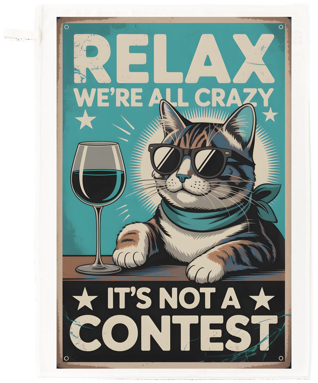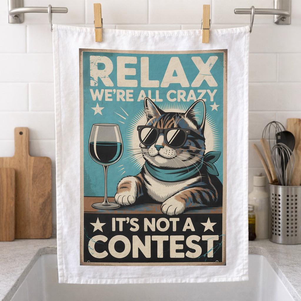 Brighten up your kitchen with this wonderfully quirky cat tea towel from Half a Donkey. Featuring a cheeky cool cat sporting sunglasses and a bandana, relaxing beside a glass of red wine, alongside the humorous slogan 'Relax, We're All Crazy – It's Not a Contest', this towel is guaranteed to raise a smile. Crafted from 100% cotton with a plain weave, it's soft, absorbent, and built to last through everyday use. Measuring a generous 65 x 47 cm and weighing 200 gsm, it's a practical size for drying dishes or hands. A convenient hanging loop makes storage effortless. Machine washable at 40°C for easy care. Whether you're treating yourself or looking for a fun gift for a cat lover, wine enthusiast, or anyone with a sense of humour, this tea towel fits the bill perfectly. The vibrant retro-style print adds a playful, whimsical touch to any kitchen décor.