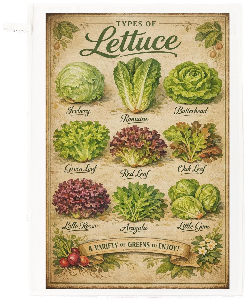 Bring charm, colour, and culinary inspiration into your kitchen with this beautifully illustrated “Types of Lettuce” Tea Towel. Featuring nine vibrant lettuce varieties—from crisp Iceberg to delicate Little Gem—this towel blends vintage artistry with modern practicality. Each leafy green is carefully labelled in a classic chart style, making it both decorative and educational.
