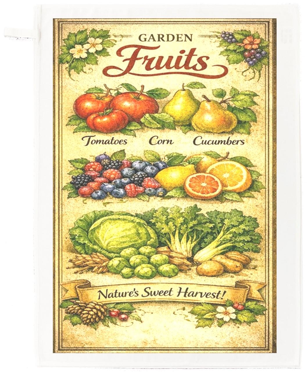 Printed in rich, crisp detail, the artwork is framed with classic botanical accents and a playful banner reading “Nature’s Sweet Harvest!”, making it a delightful decorative piece as well as a practical kitchen essential. Whether hung on a hook, draped over an oven handle, or styled in a sunny kitchen display, it adds a cosy, countryside feel to any home.