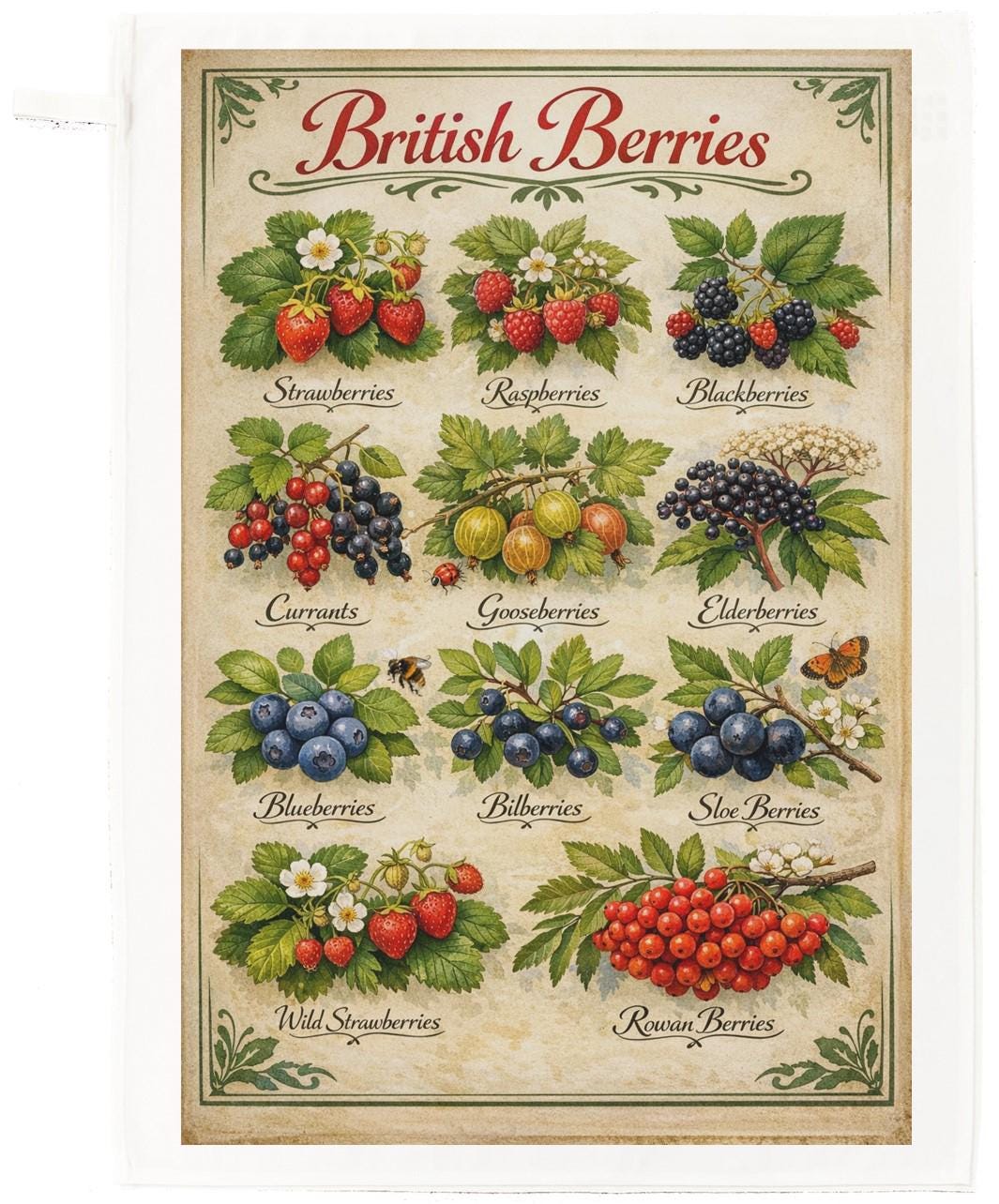 "Bring a touch of classic British charm to your kitchen with this beautifully illustrated British Berries Tea Towel. Featuring twelve hand drawn berry varieties, such as Strawberries, Rapsberries, Blackberries, Currants, Gooseberries, Elderberries, Blueberries, Bilberries, Sloes, Wild Strawberries and Rowan Berries, arranged in a vintage botanical chart style, it blends practicality with timeless décor appeal. The warm parchment background and detailed artwork make it perfect for everyday use, gifting, or displaying as wall art in a cottage inspired home.