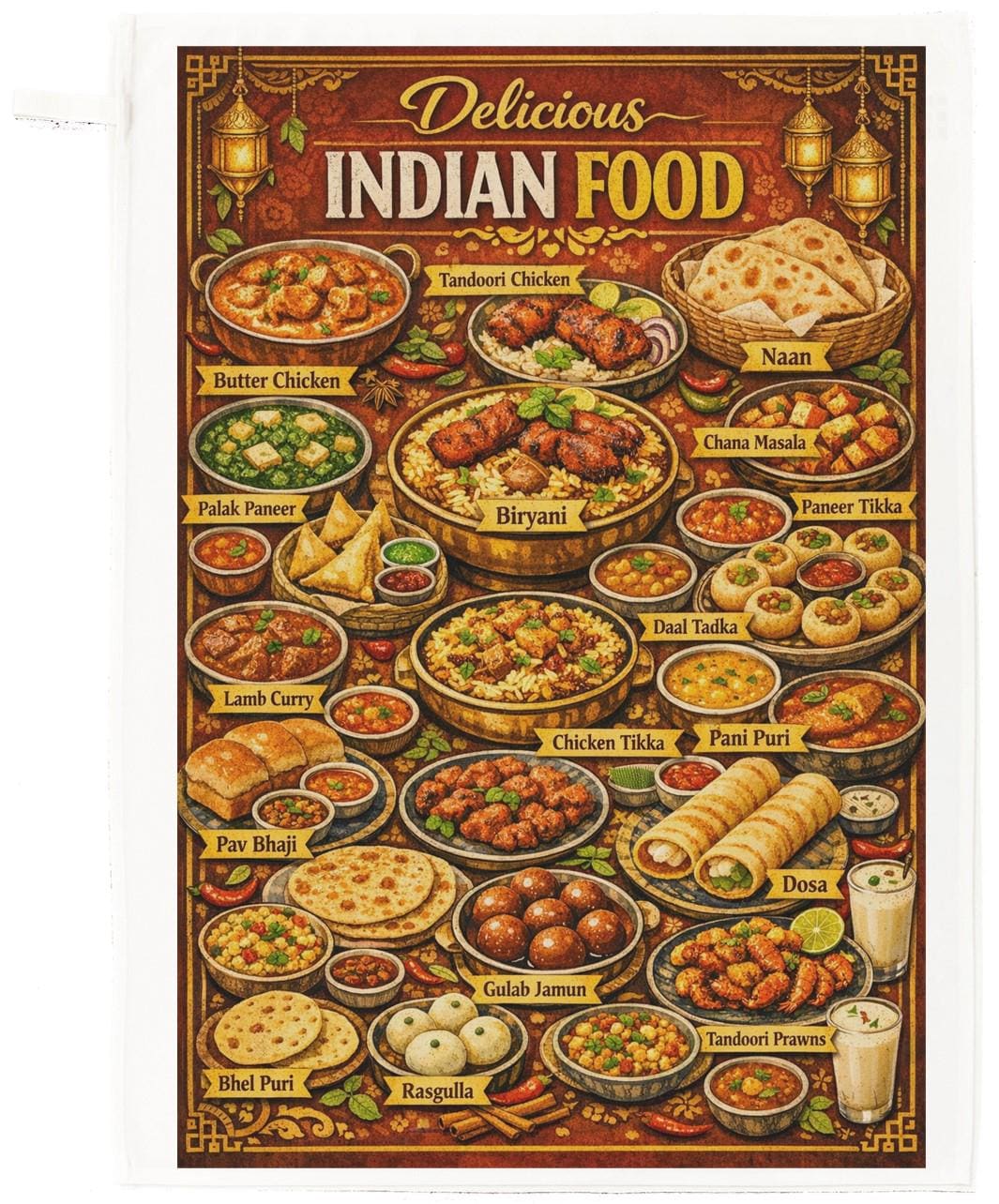 Bring colour, culture, and culinary charm into your kitchen with this beautifully illustrated Indian Food Tea Towel. Featuring a vibrant collection of iconic dishes — from Butter Chicken and Biryani to Dosa, Pani Puri, Gulab Jamun and more — this towel is both practical and delightfully decorative. Each dish is clearly labelled, creating a fun and eye catching food chart that brightens any space.
