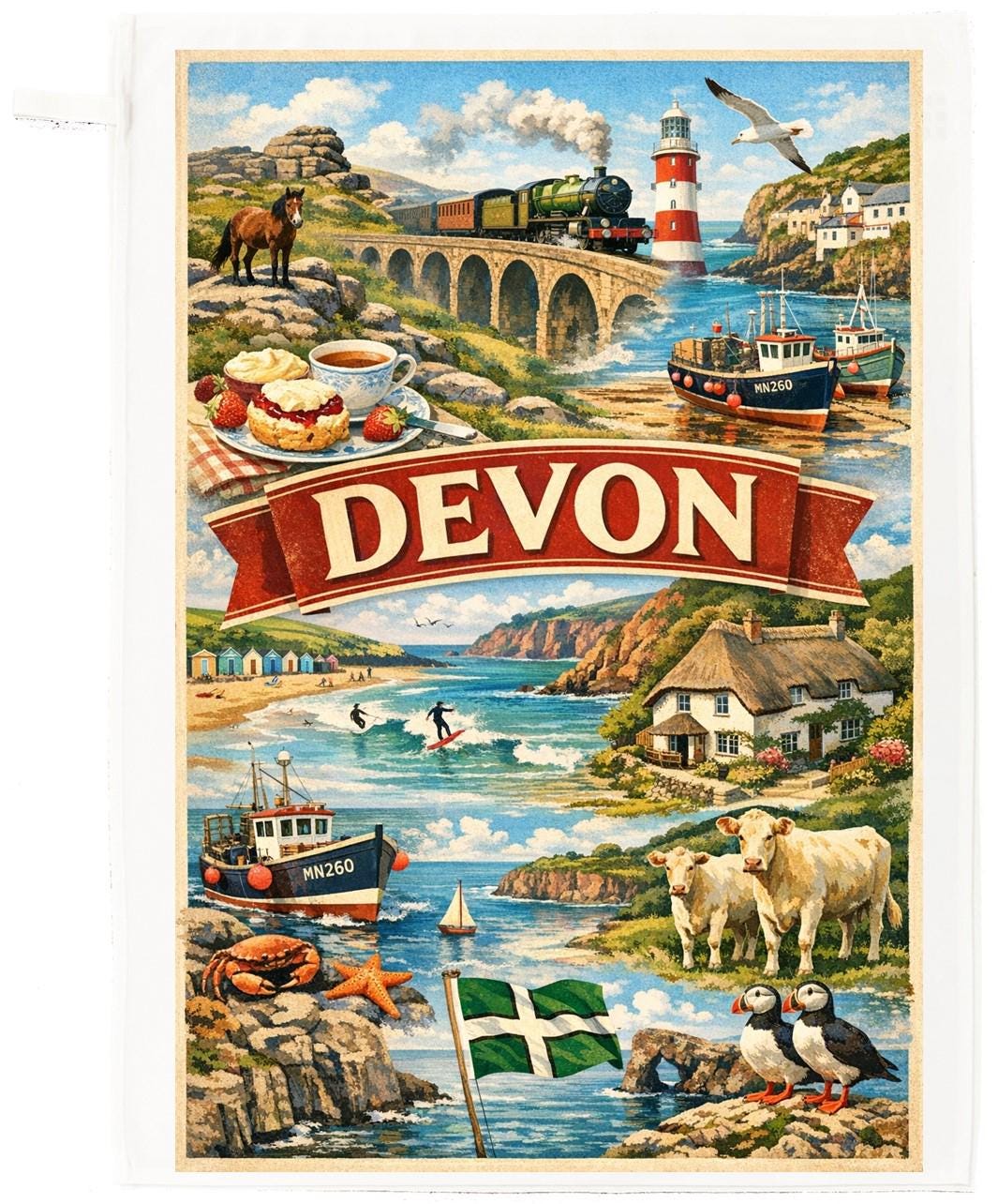 Bring the charm of Devon into your kitchen with this beautifully illustrated tea towel, celebrating the county’s most iconic coastal and countryside scenes. From steam trains and fishing boats to puffins, cream teas, moorland ponies, and colourful beach huts, every detail captures the spirit of Devon in a warm, nostalgic style.