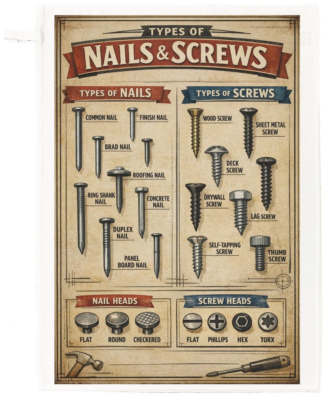 Bring colour, culture, and culinary charm into your kitchen with this beautifully Bring practical charm and workshop style character into your kitchen with this beautifully illustrated Types of Nails & Screws Tea Towel. Designed as a vintage inspired hardware chart, it showcases detailed drawings of common nails, screws, and head types—perfect for Fathers Day, DIY lovers, makers, and anyone who appreciates functional design.