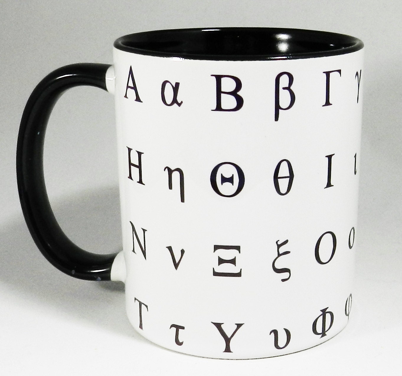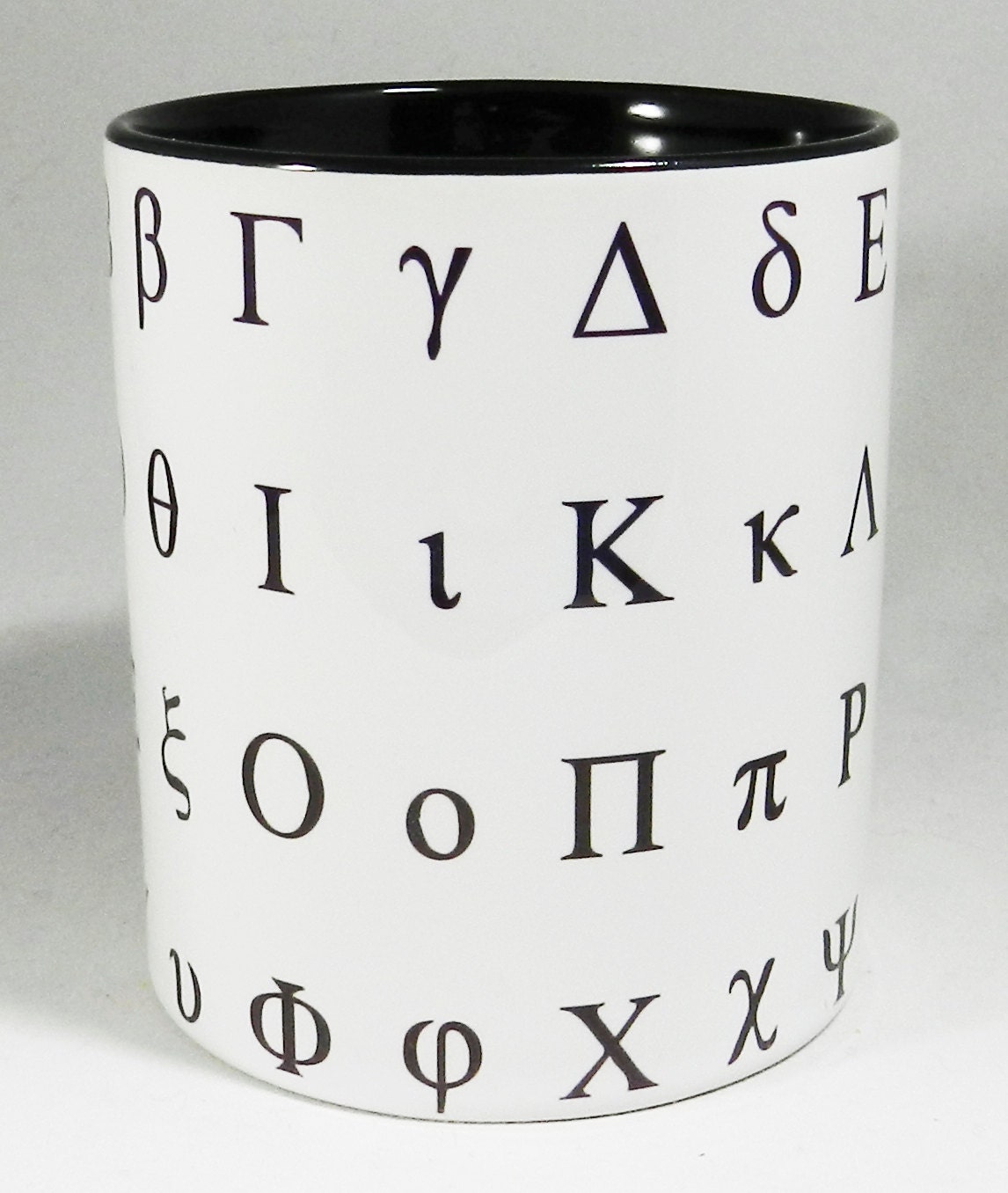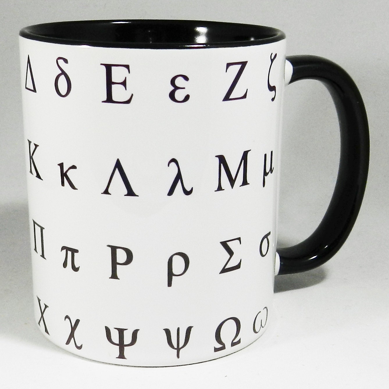 The Greek Alphabet Educational Ceramic Mug with glazed black handle and inner.